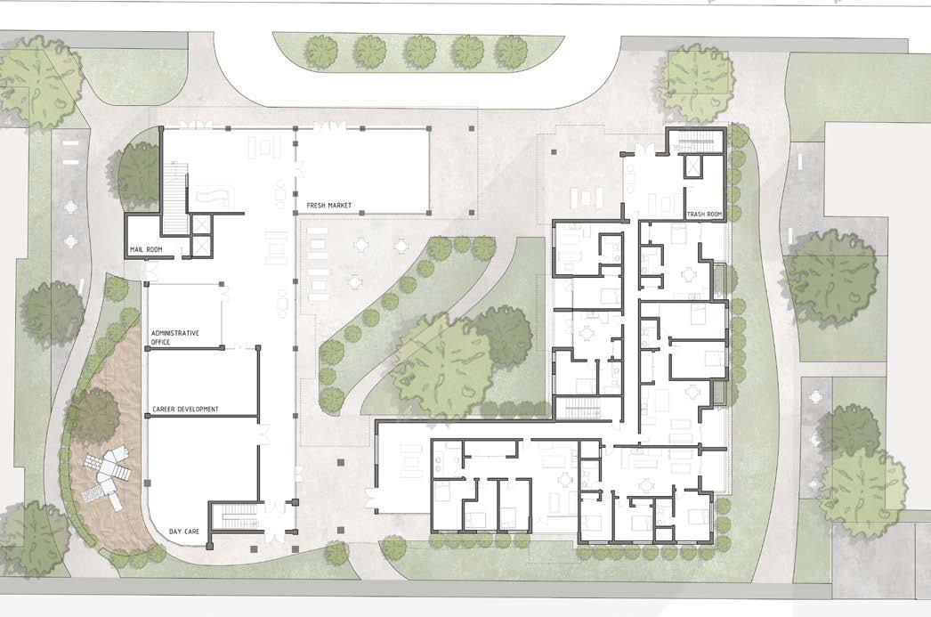 Embrace is an affordable housing complex nestled between the educational and residential sectors of the neighborhood, grounded by the historic, Le Droit Park. A friendly node in the midst of this neighborhood, Embrace offers not only physical connections but also chances for community interaction within the space. It is comprised of 2 parallel buildings connected by community balconies to allow for people to stop and visit with their neighbors as they circulate throughout the building.