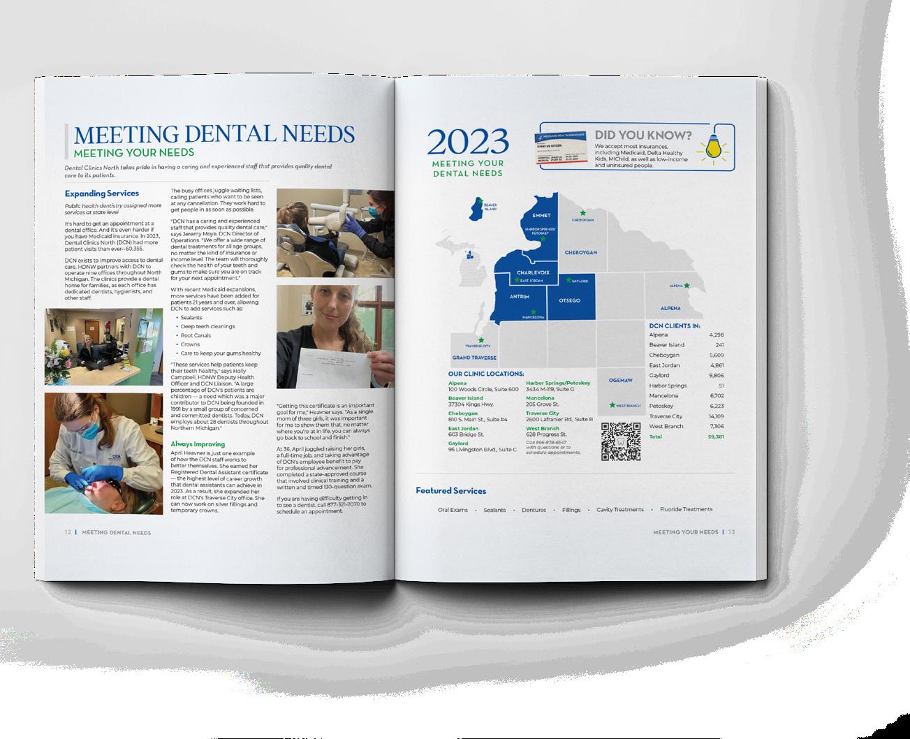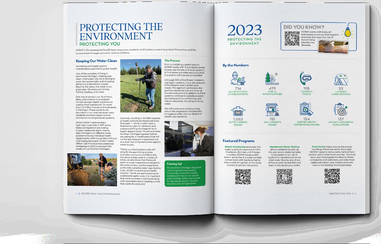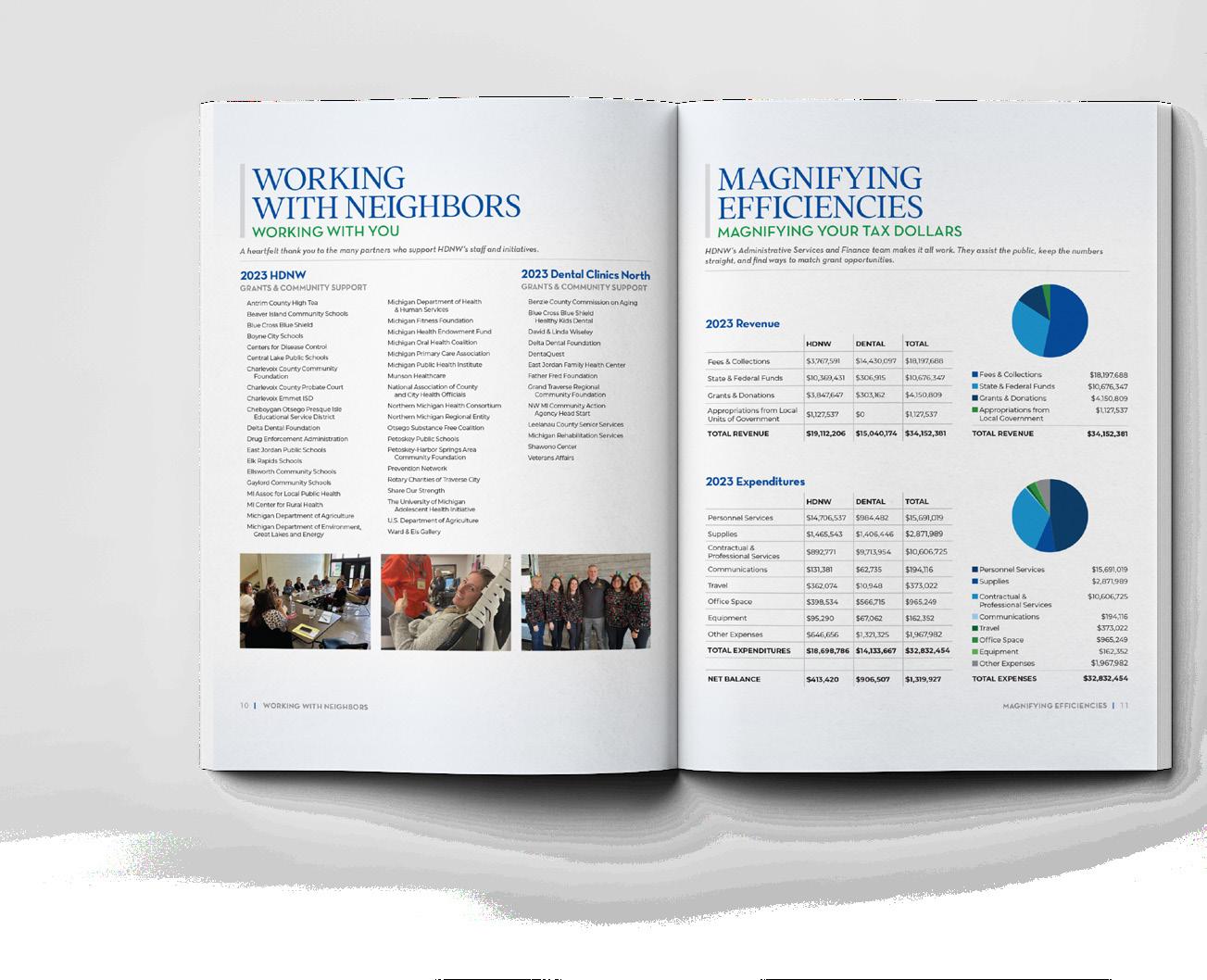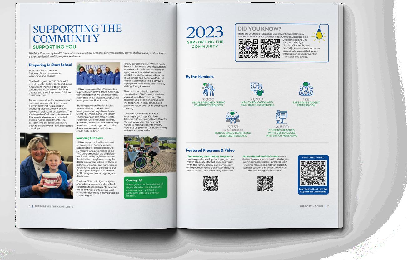 In this annual report for the Health Department of Northwest Michigan (HDNW), I had the opportunity to bring the theme “And You” to life, emphasizing the crucial connection between the Health Department and the communities it serves. I designed custom icons to highlight key data points and crafted engaging layouts to showcase the department’s success stories and featured programs. My goal was to create a design that not only presents important information clearly but also resonates with the audience on a personal level. This report reflects my commitment to translating complex data into accessible and visually compelling elements, demonstrating how thoughtful design can enhance communication and impact.