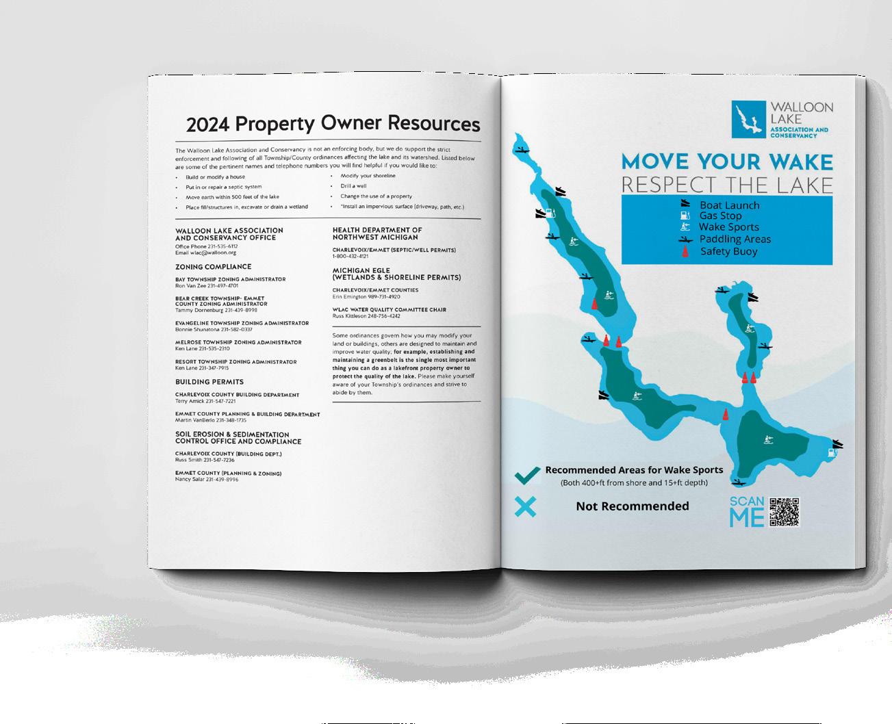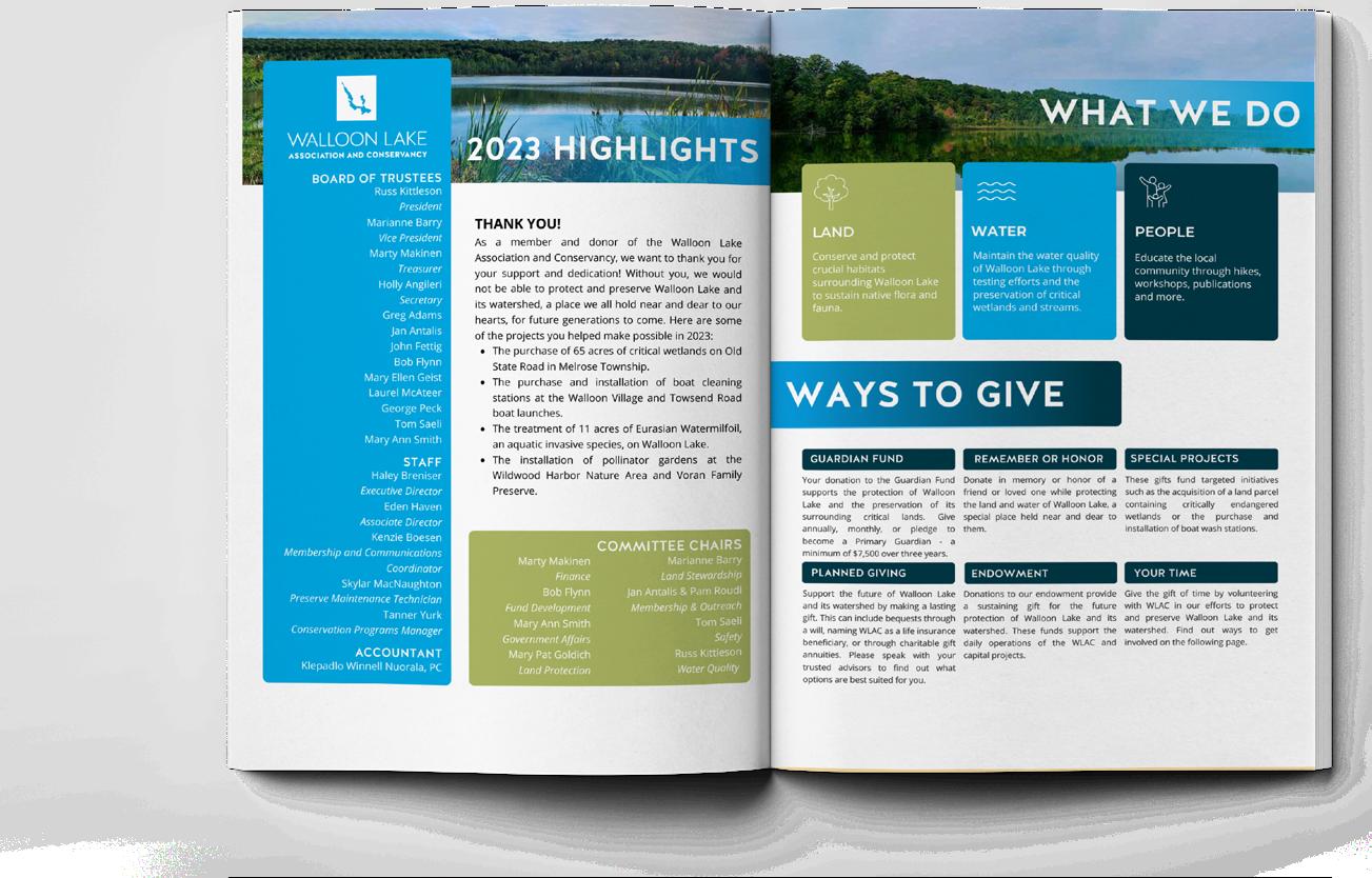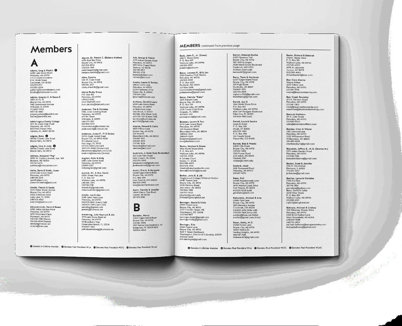Walloon Lake Association and Conservancy faced the challenge of distributing a vast amount of detailed information in an organized and engaging manner. To address this, I designed an extensive directory that features a detailed member listing and an overview of the association’s mission and annual events. This project effectively solved the problem of information overload by presenting critical data with sophisticated organization and high-quality design execution, ultimately enhancing member engagement and streamlining communication.