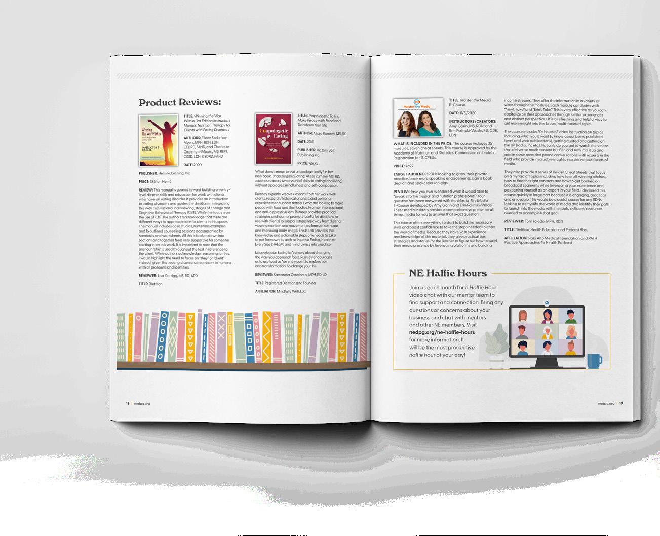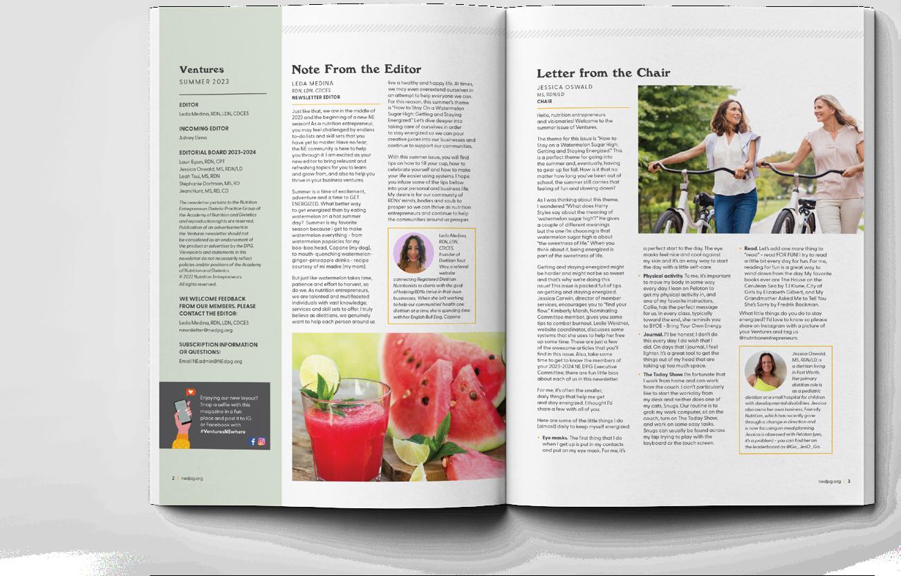 As the sole designer for Nutrition Entrepreneurs’ quarterly newsletter (Ventures), I am responsible for the comprehensive layout of each issue, including Winter, Spring, Summer, Autumn, and Membership editions. My role encompasses transforming a provided Word document with articles into a polished, cohesive publication. I carefully select stock photography that aligns with the organization’s commitment to education, inclusivity and diversity. I also manage and integrate author headshots, credentials, and biographies, ensuring a professional and organized final product that reflects both the quality of content and the organization’s values.