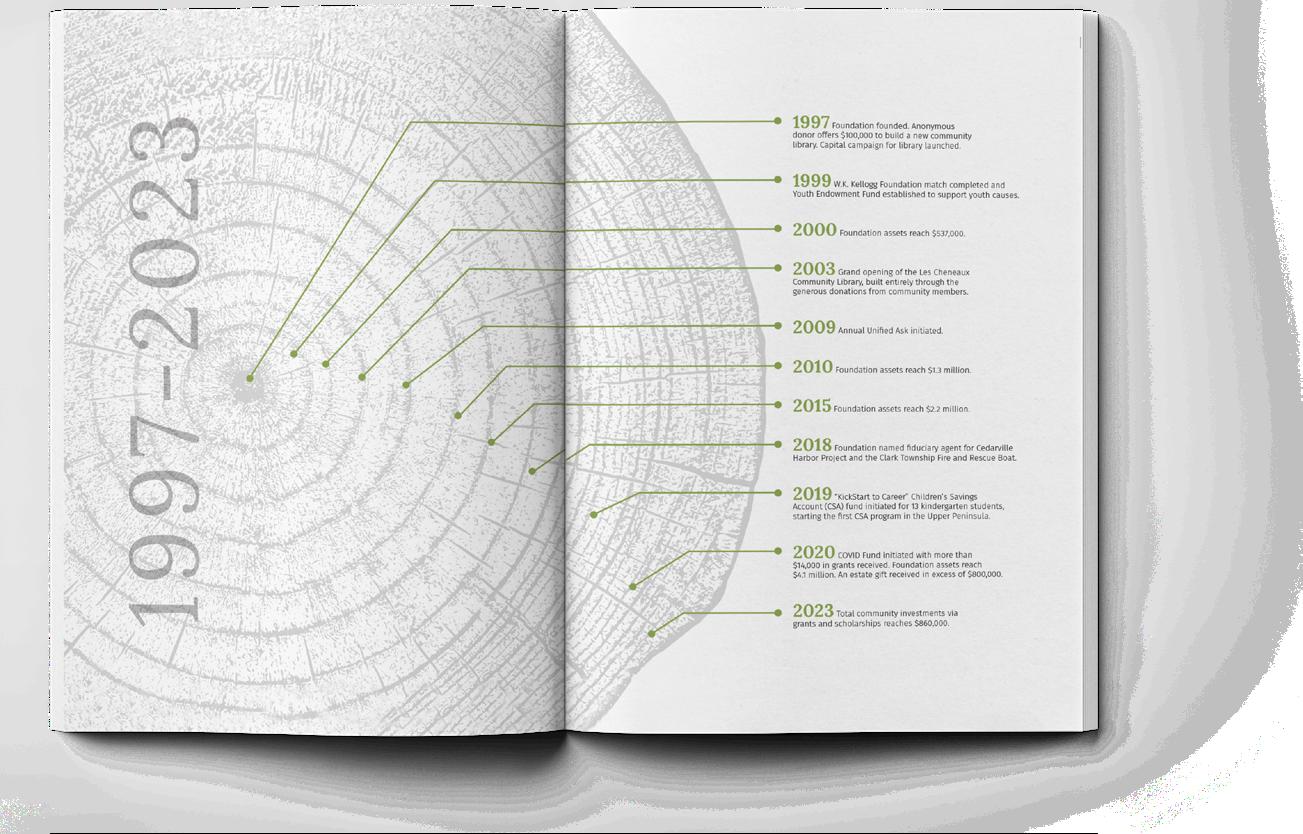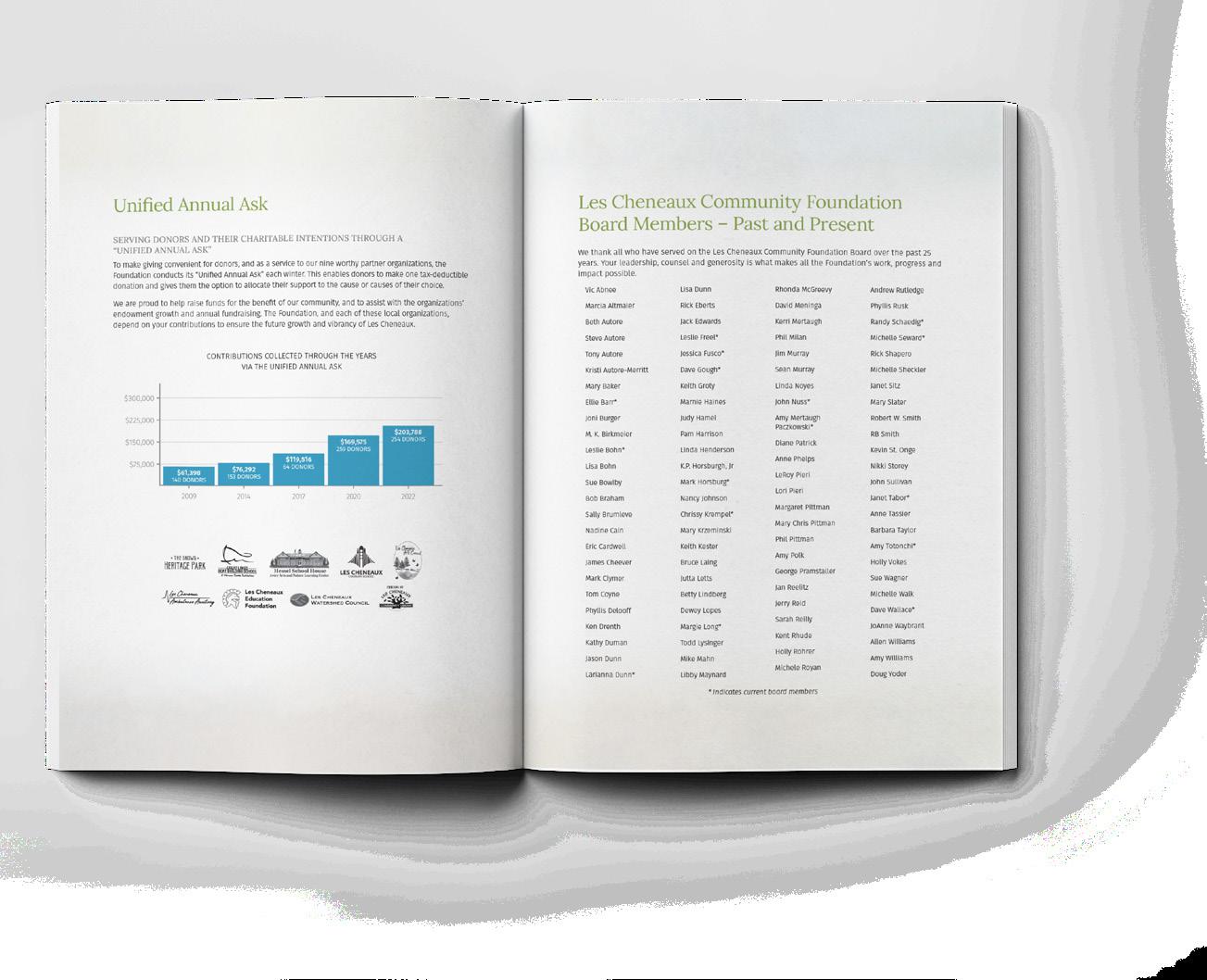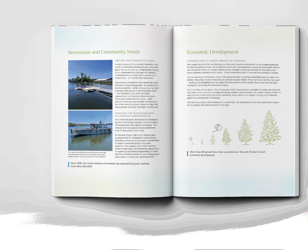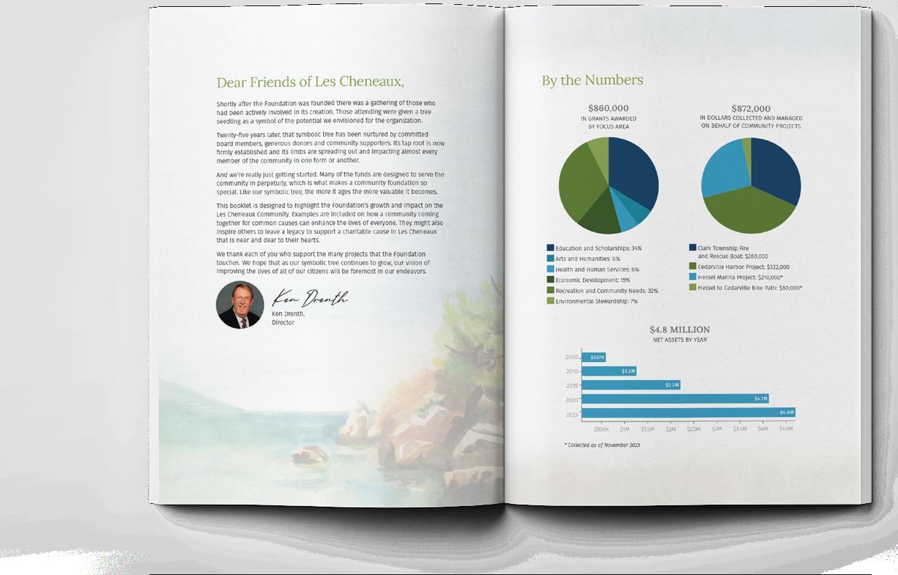 In 2023, I had the privilege of crafting the Les Cheneaux Community Foundation’s annual report. This piece highlights the natural beauty of the Les Cheneaux Islands, as the design integrates earthy watercolors and other organic elements to reflect the region’s serene landscape. Balancing a refined professionalism with a deep connection to nature, the report uses these natural motifs to elegantly present data and narratives, creating a harmonious and engaging experience for its readers. This project not only celebrates the foundation’s achievements, but also reinforces their commitment to preserving the unique charm of their community.