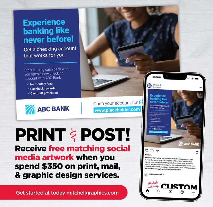 Here are a few social media posts that highlight my role in overseeing Mitchell Graphics’ social media marketing efforts, from conceptualization to execution, as a key member of our small marketing team. In addition to crafting these designs and handling the copywriting, I create a range of other marketing collateral to ensure a cohesive campaign. This includes creating matching direct mailer postcards, email blasts, and ads for other platforms. These marketing efforts are created to elevate Mitchell’s online presence, attract prospective customers, generate leads, increase website traffic, and engage our audience. My work showcases my ability to blend creativity with purpose across a diverse digital landscape.