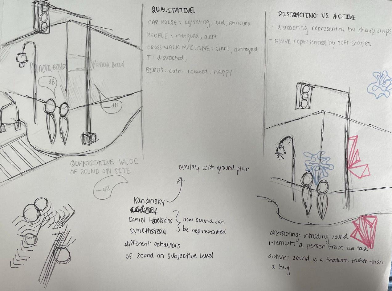 Performing a sound analysis of an urban environment reveals the ultimate, subjective experience of that location. While observing this atmosphere, I emphasized whether the sound was active or distracting in this series of diagrams. Referencing Kandinsky’s artwork representing synesthesia and Libeskind’s study of spatial music, I created a way of representing sound diagrammatically through abstract shapes, lines, and colors that relate to the subjective experience of the space.