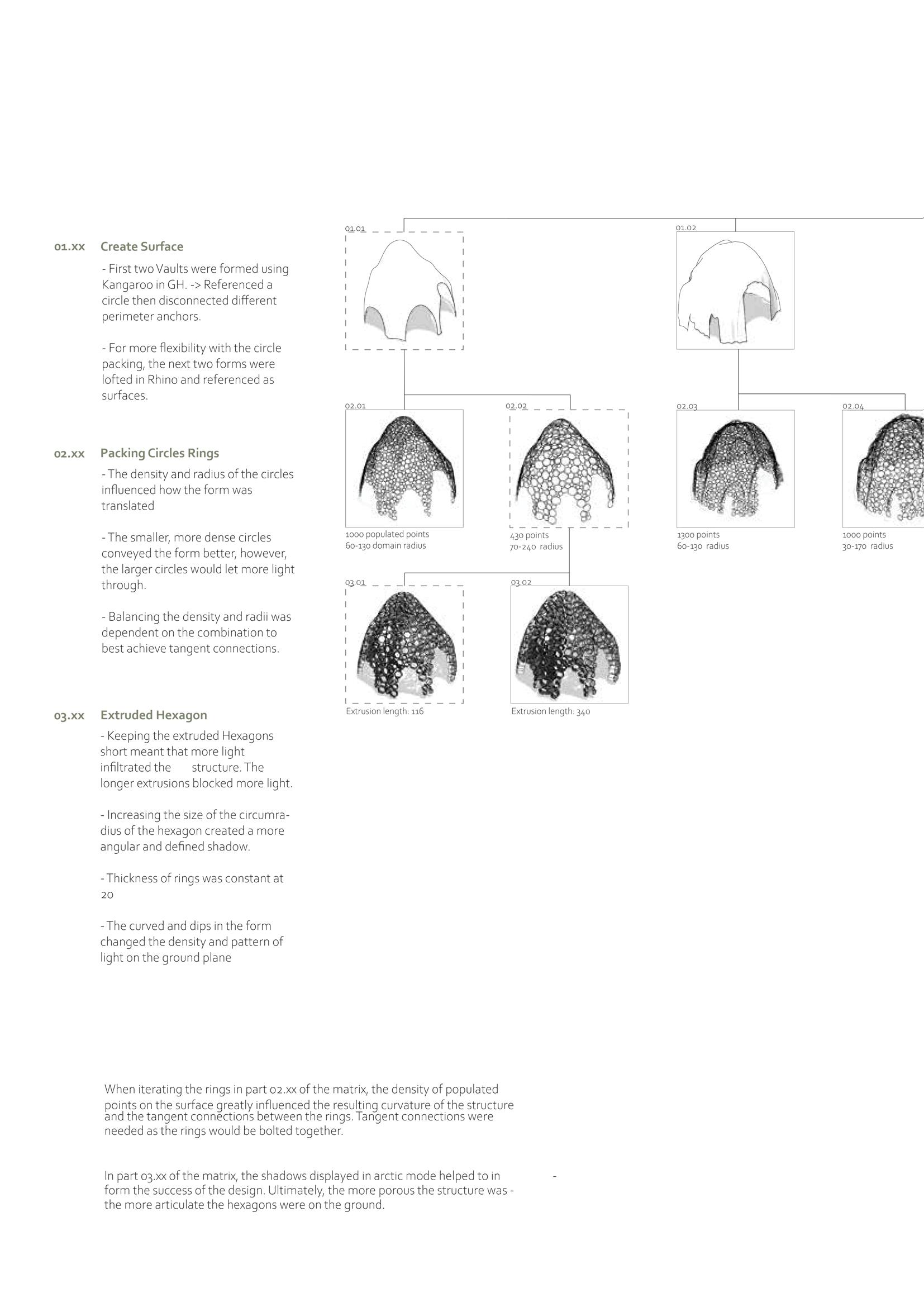 Sunlight is fluid, changing with the time of day and weather, and so the sweeping curves and the positioning of the hexagon rings at these normals mean sun light can continuously be sieved through. Light rays bounce off the surface of the burnt copper metallic rings, rather than be absorbed, which amplifies the changing light quality - as opposed to it being absorbed by the structure.