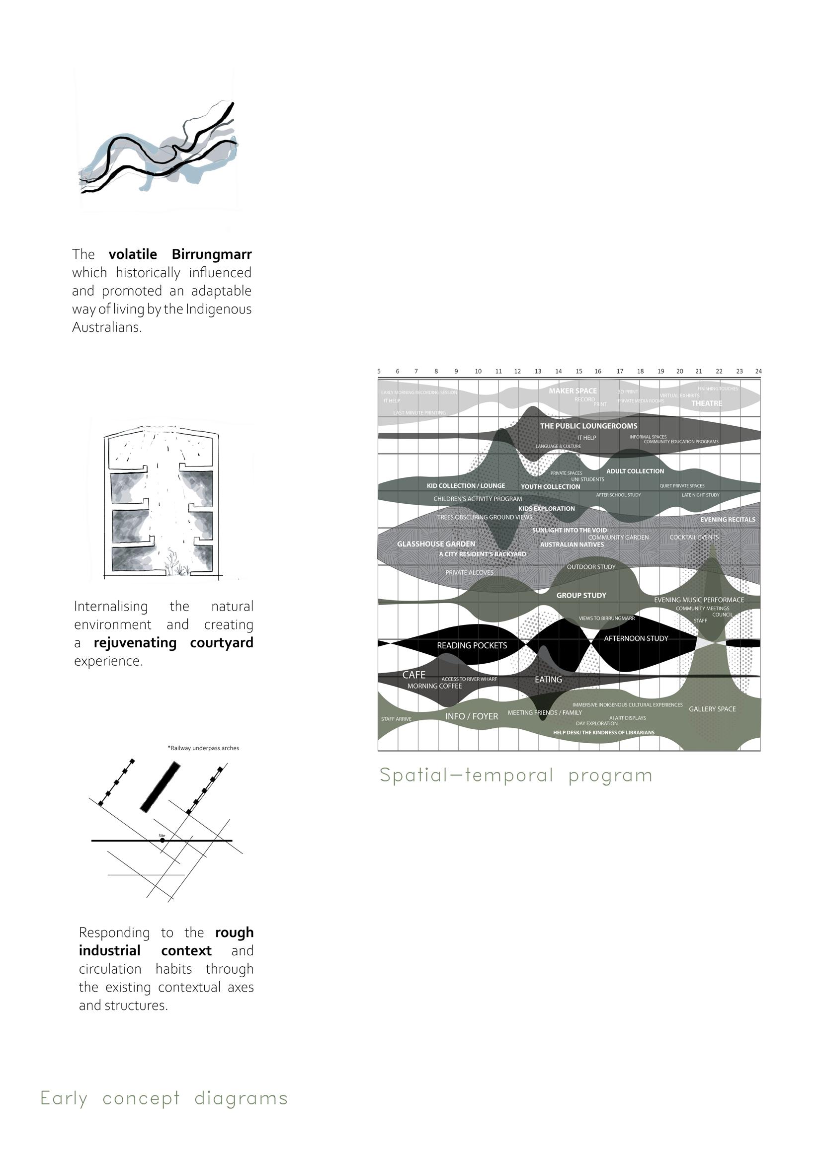 Throughout the semester there was consideration of the library and the city through a unique attitude based off subjective experience and the physical reality Iterating through plan, section, models and diagrams, a series of building proposals were considered for the design on the site at Enterprise Park, located next to the Yarra River under the train line.