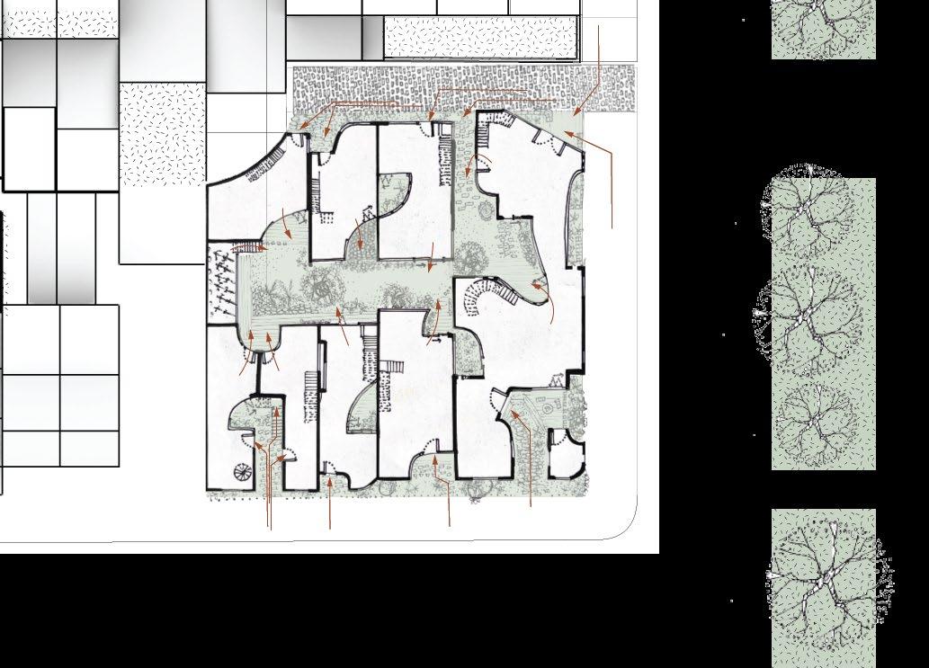 Entry to the site from the city is depressed below the current ground level to create a feeling of expansion and liberation as people cross the threshold from the industrial and commercial city into a space which allows them to just be. The central atrium, the heart of the center channels light throughout the core and establishes an indooroutdoor experience to promote an experience that rejuvenates.