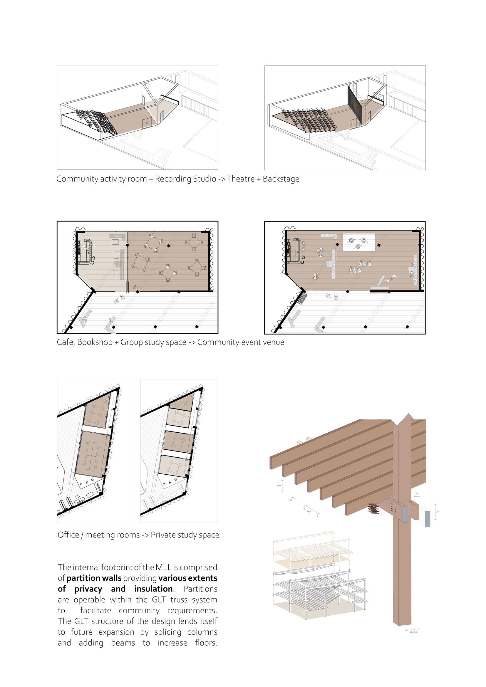 The MLL, A library with a central atrium and garden, to channel light throughout the core and establish a rejuvenating experience perpetuating across all floors of the library. The timber structural system formalises the floor plan layout and defines the volumes of the internal spaces.