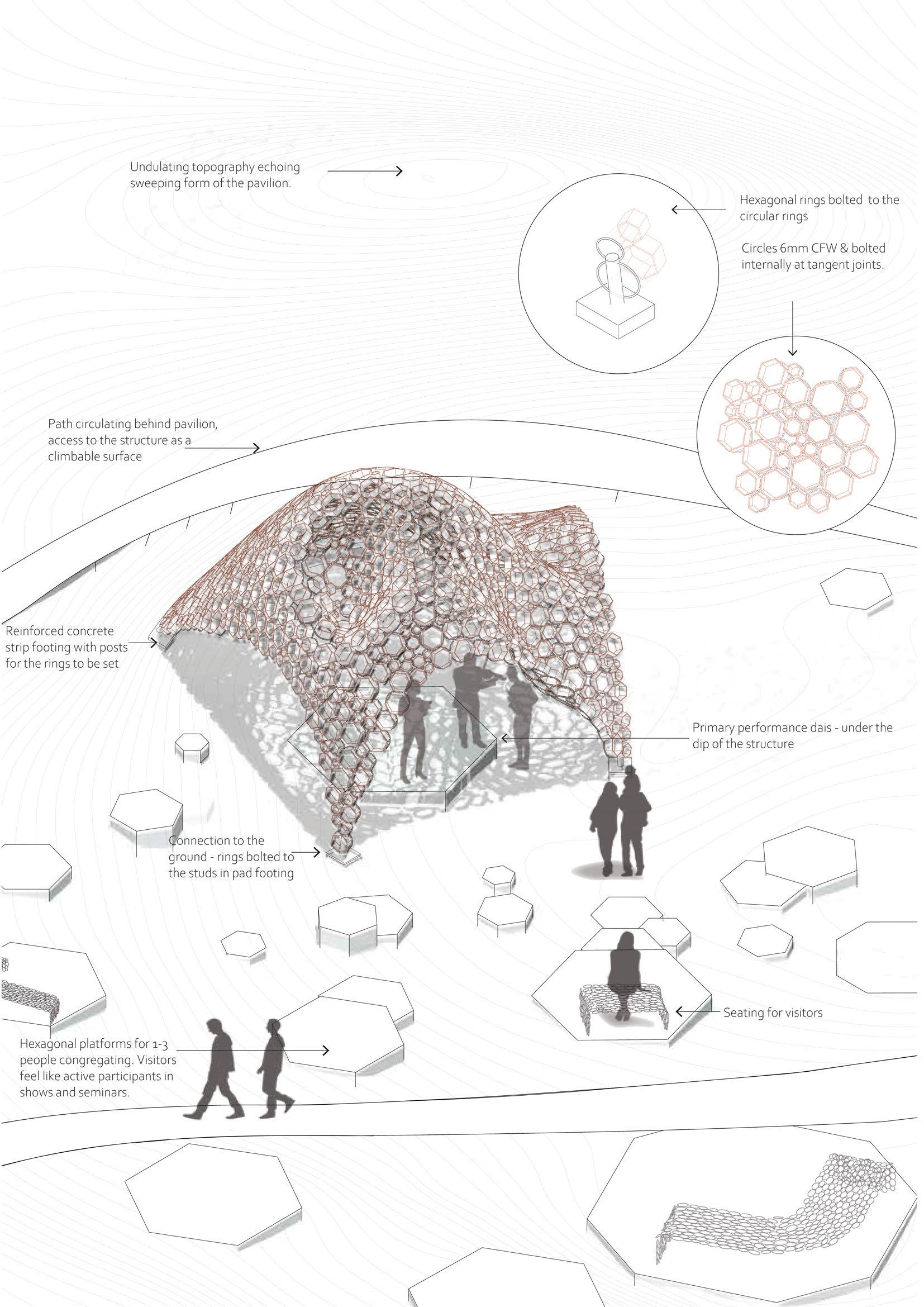 The one Pavilion was to facilitate two various activities and so the project was considered at varying scales. The hexagonal platforms in the landscape propose a changing density and the spectator’s engagement with the event.