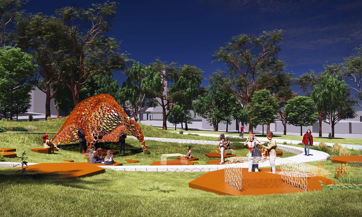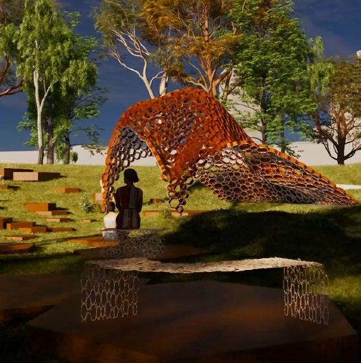 The Sun Sieve Pavilion has been conceptualised with the intention of channeling sun rays to create theatrical performances of light on and under the pavilion, complementing the spectacles that are concurrently occurring.