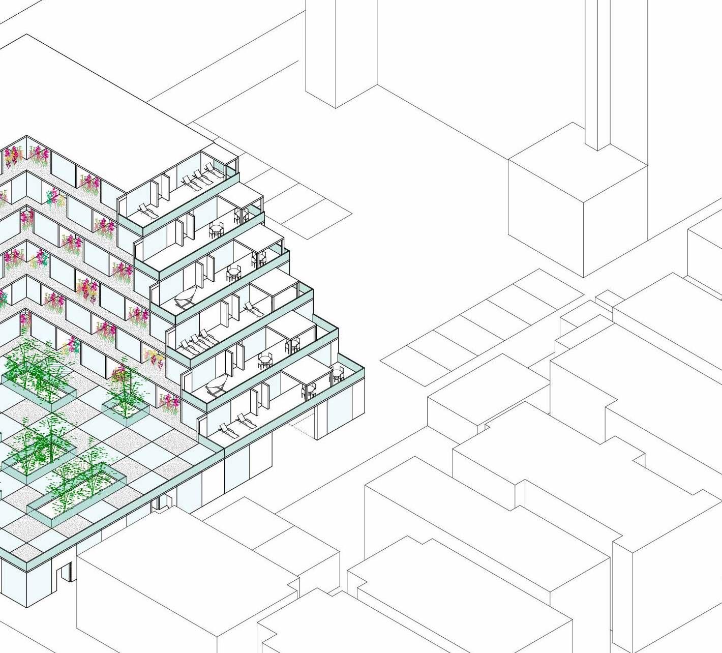 The ground floor level is open to both residents and the public and include , which is not typically widely available in dense cities. An outdoor cou All other floors above this are composed of housing and residential am the ground floor and con SECTION PERSPECTIVE