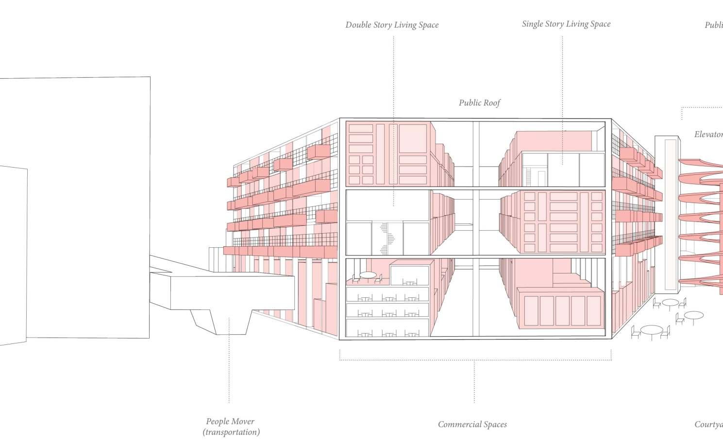 The housing units are located on the second and third floors. They are made to be adaptable and changeable based on the occupancy size through the use of easily removable walls. The prefabricated units get placed in modules based on the structure. The modular condition mimics the idea of cars filling in the space, leaving traces of the building’s original function as a parking garage.