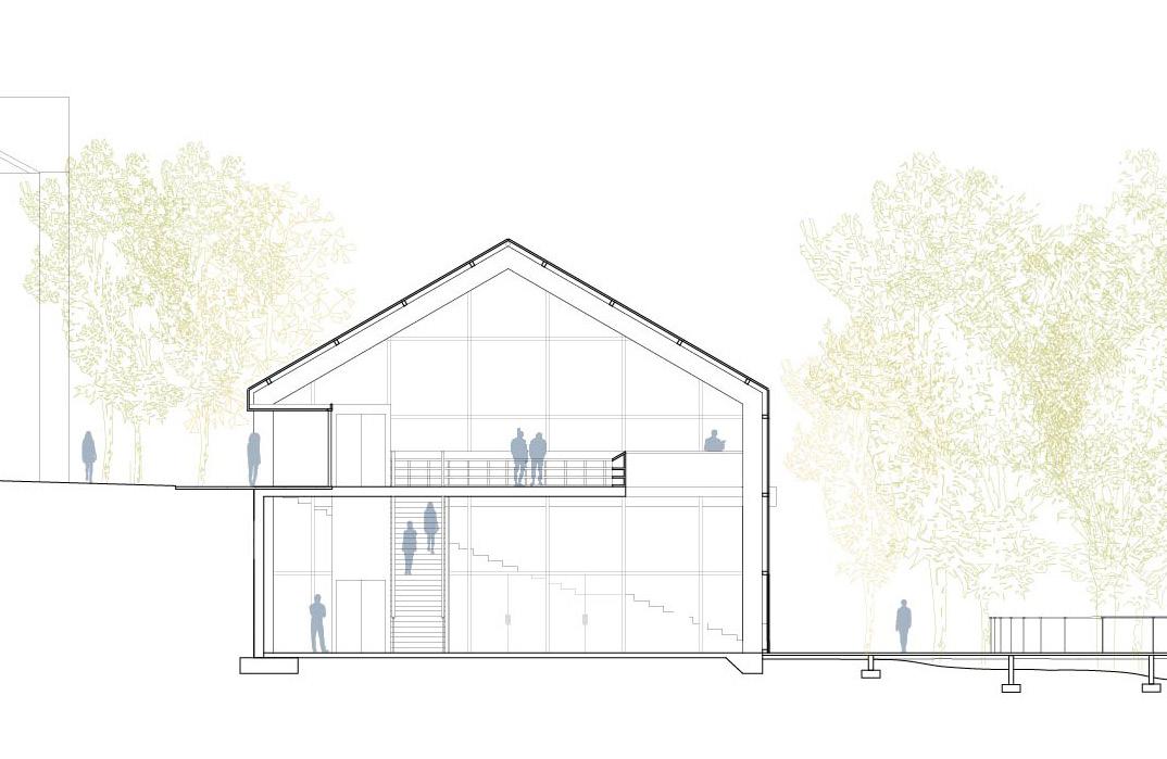 vironmental Affordance regarding sun path in mind. The courtyard surrounding the glass and glue-laminated wood curtain walls on the “Barn” allow light to shine in plicitly and explicity, delicately interacts with the nature that surrounds it.