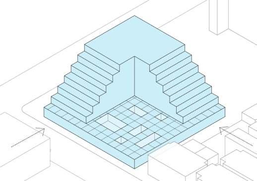 The construct responds to the limited square footage available at the ground level by building upwards and encouraging people to venture to a higher level through its overall stepped form and various programs. It then maximizes space by occupying the roofs of neighboring buildings.