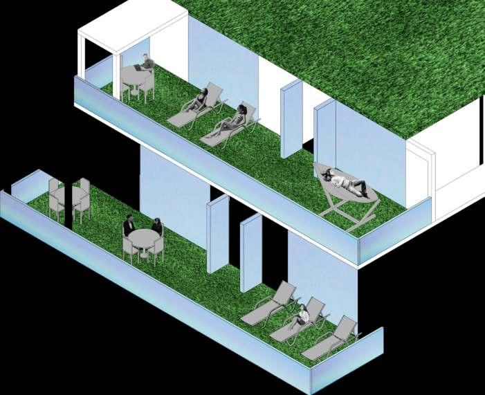 flat, industrial landscape. The basis of this temporary housing project is to go against this urban condition in ents of nature all throughout it, allowing for a more natural condition that contrasts the environment it is being to nature even when they are inside.
