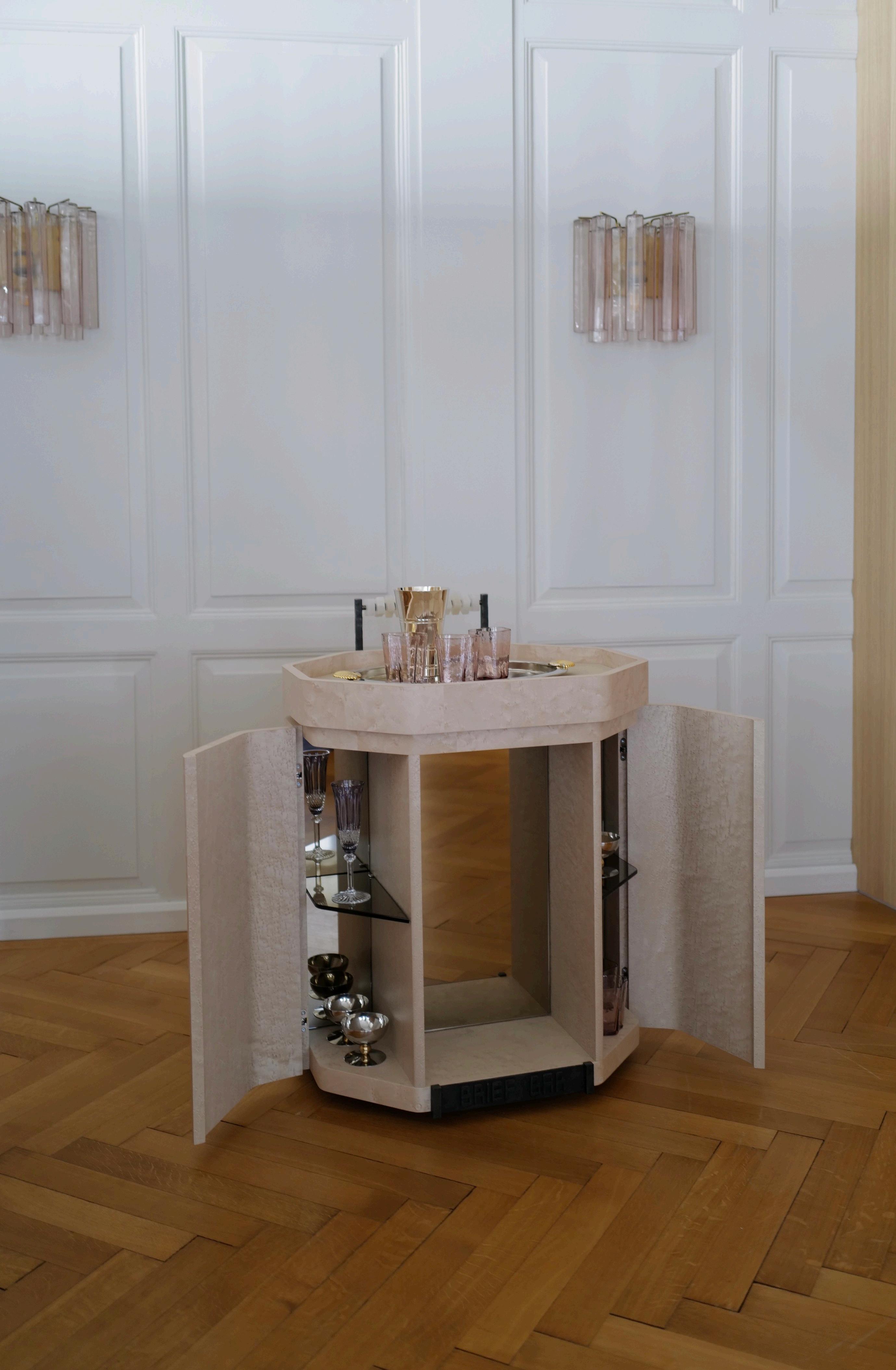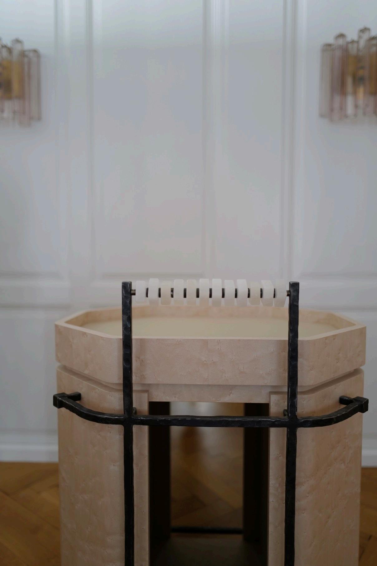 Oak wood, brass, metal, “bird’s eye” veneer, glass, leather, onyx H 97 x W 200 x D 60 cm