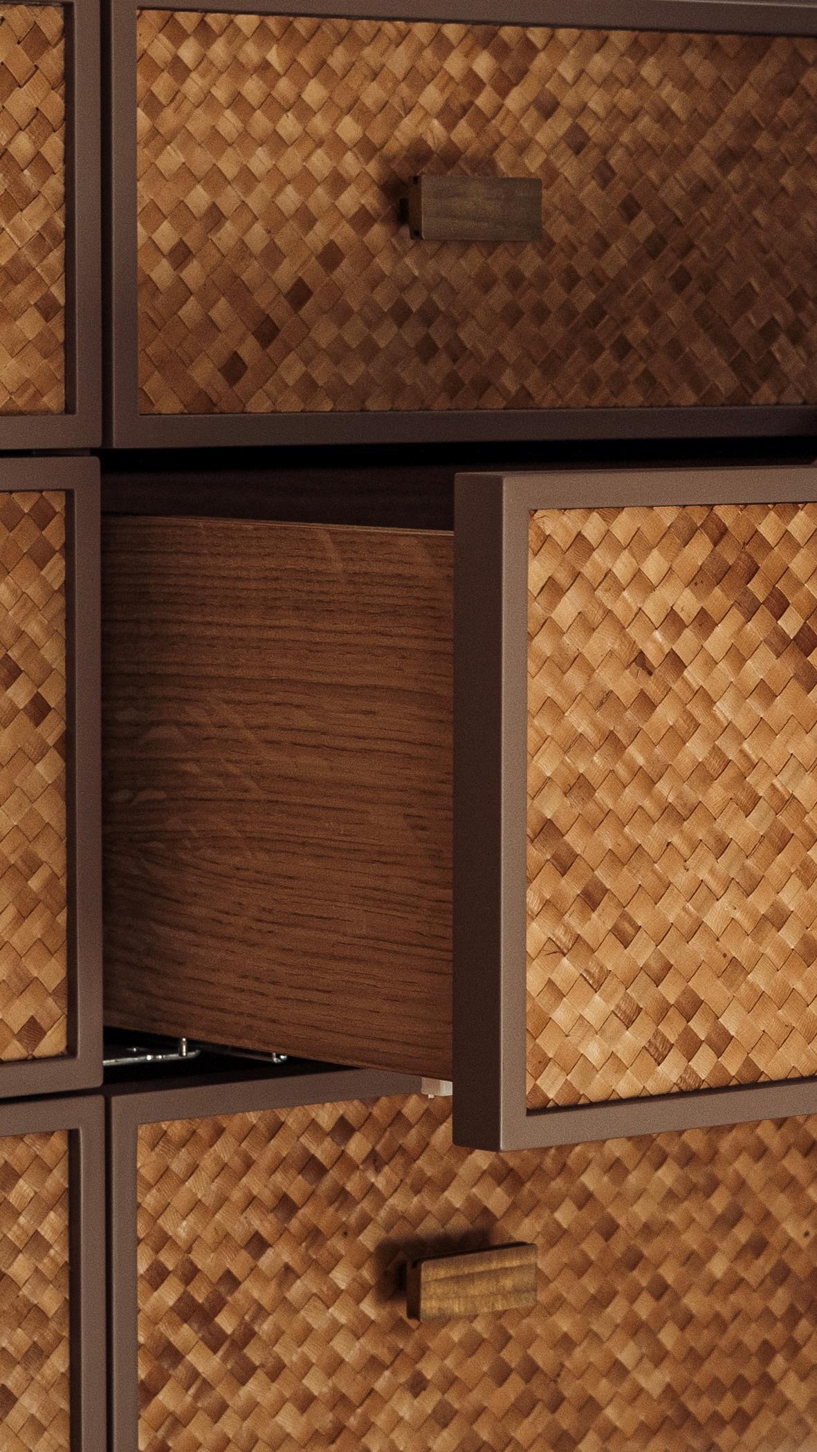 Walnut solid wood, ceramic hand-crafted tiles, hand-patinated metal. H 77 x W 330 x D 130 cm