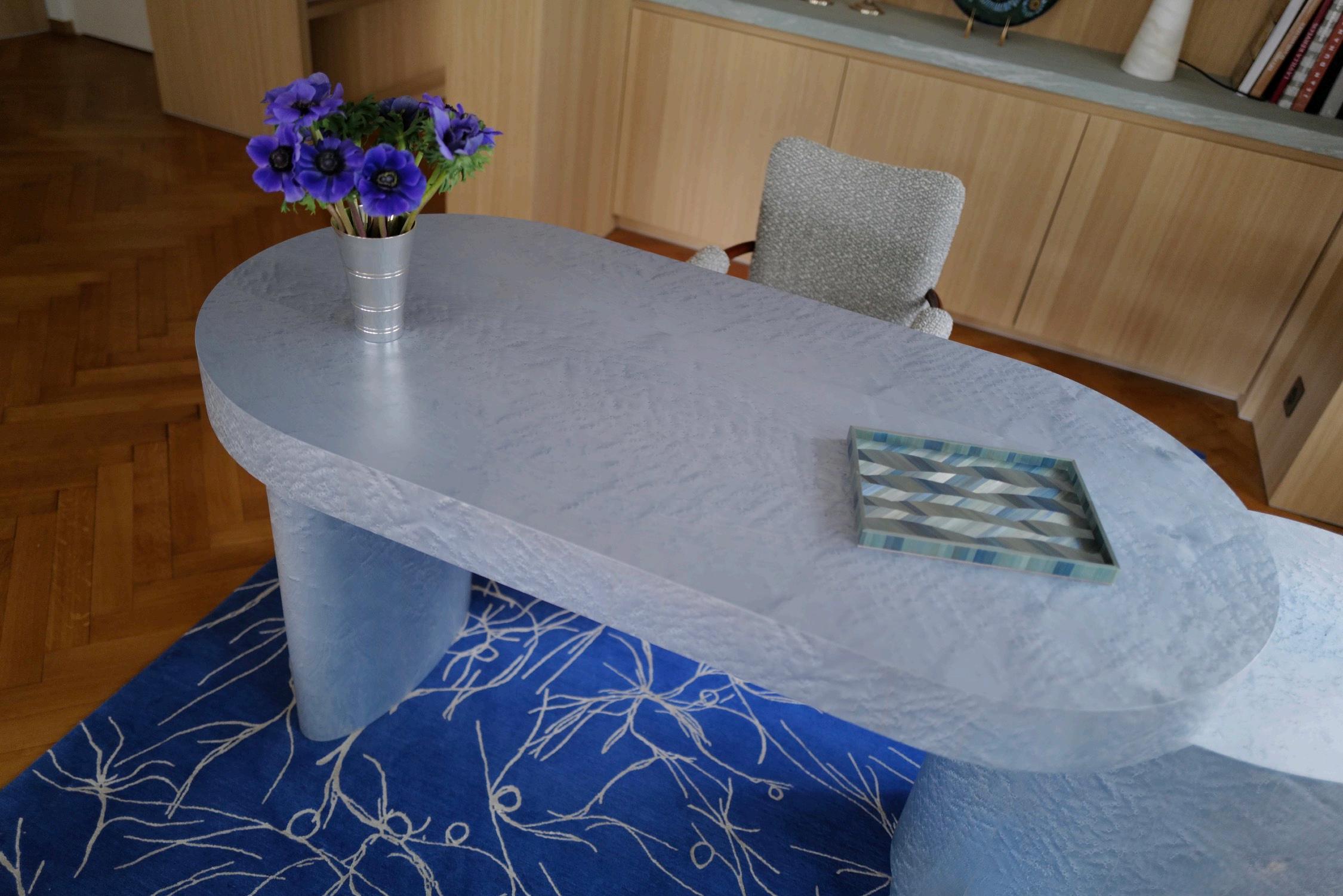 Crafted from light blue "Bird-eye" maple wood veneer, the Poseidon Desk exudes the delicate beauty of sea foam while maintaining its sturdy proportions.