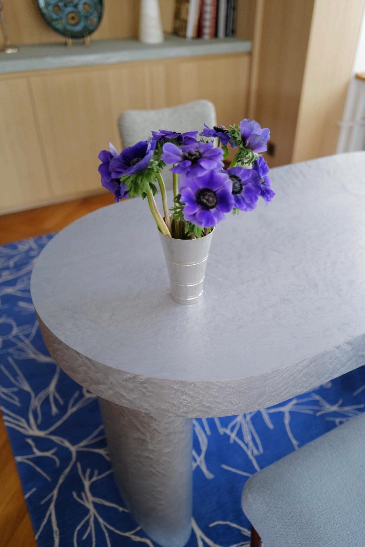 Aluminum coloured tabletop, bronze patinated brass leg. H 91 x W 135 x L 267 cm
