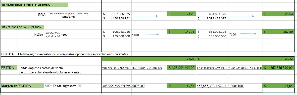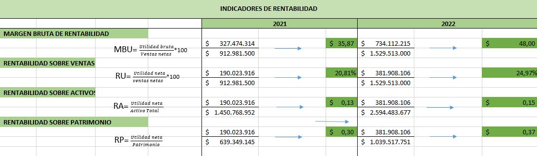 • Rentabilidad sobre Activos: las inversiones de los activos para el 2022 fue de 0,15 respecto al 2021 que fue de 0,13 lo cual nos muestra que en el año 2022 las inversiones de los activos es as rentable frente a la utilidad de la empresa.