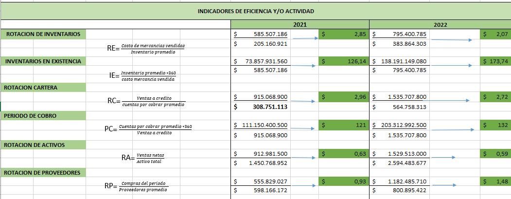 • Rotación de Inventaros: Indica que la empresa está rotando alrededor del 2,85 en el año 2021 y para el año 2022 la rotación es de 2.07 lo cual nos dice que está un poco lenta.