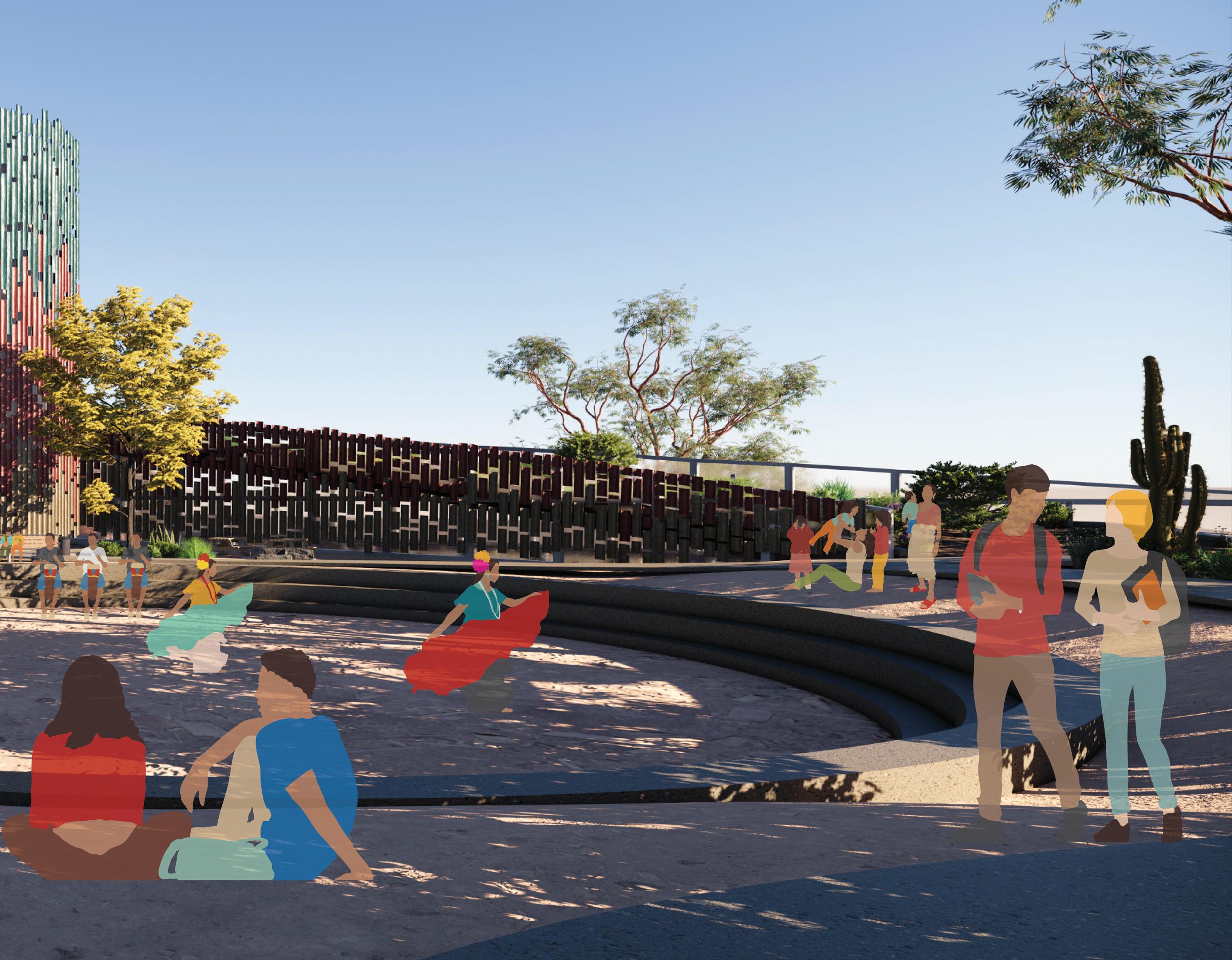 Blue Palo Verde and Velvet Mesquite trees form a grove around both the paved plaza and sunken courtyard. Users can experience the trees at different elevations