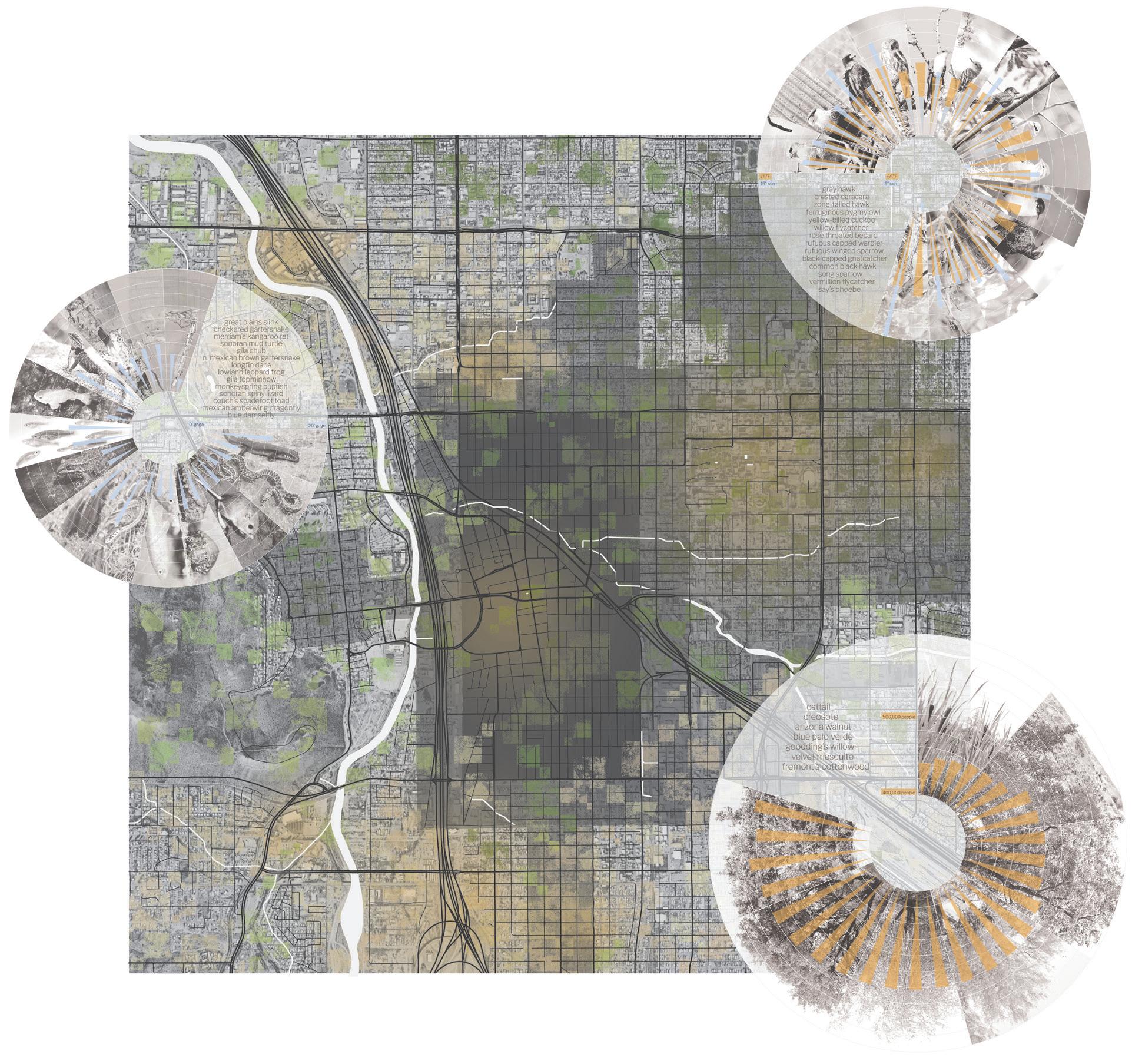 Mapping the consequences of the decentralized urban sprawl of Tucson: population increase, resource exploitation, heat pollution, and decrease of tree canopy, as well as the general climate changes over the past 10 years. Overlayed are the animal and plant species that have faced endangerment, extirpation, or extinction from these changes to their native habitats.