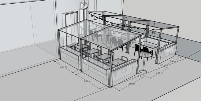 A summer terrace design was proposed for RUA Woodfired Pizza, located in Phibsborough, Dublin, with the aimof enhancing the restaurant’s outdoor dining experience. The central focus of the design was to maximise the available space for seating, ensuring that the layout could accommodate a larger number of customers without sacrificing comfort or efficiency. By strategically arranging tables and optimising the flow of the space, the design aimed to create an inviting and functional environment thatwould allow for increased seating capacity while maintaining a pleasant dining atmosphere.