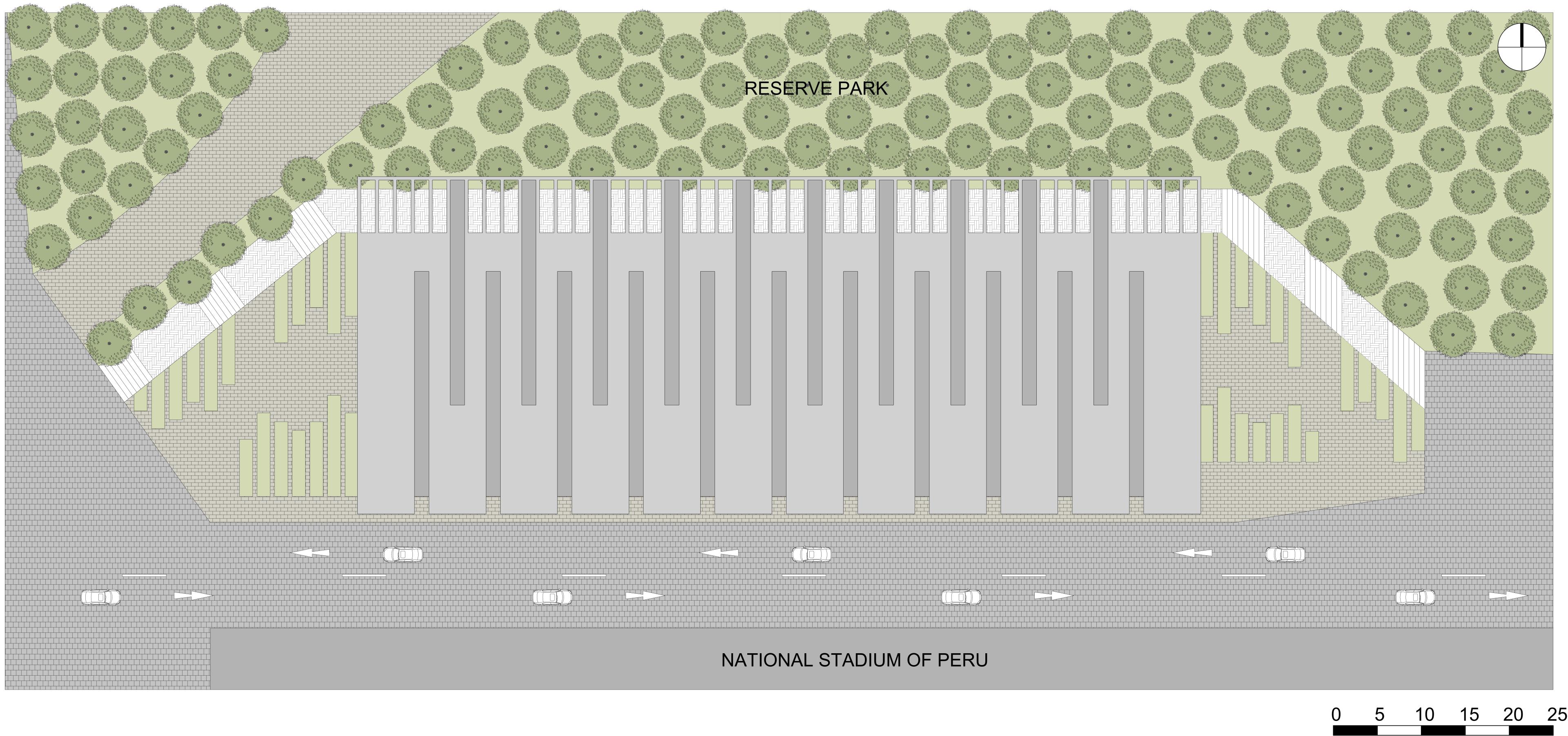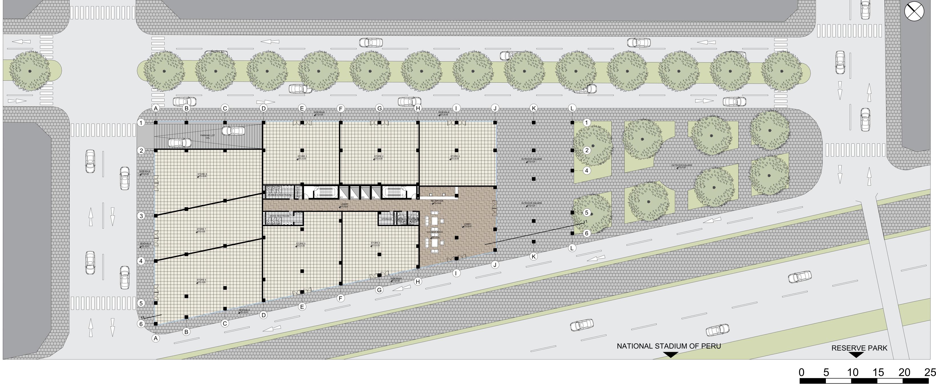 The project is organized around a primary architectural gesture: a cantilever located on the east side of the site, which becomes the main articulating and defining element of the proposal. This prominent volume not only introduces dynamism and directionality to the composition but also functions as a visual landmark, guiding the pedestrian’s gaze toward two significant urban references — the National Stadium of Peru and the emblematic Parque de la Reserva, both architectural and cultural icons of Lima.