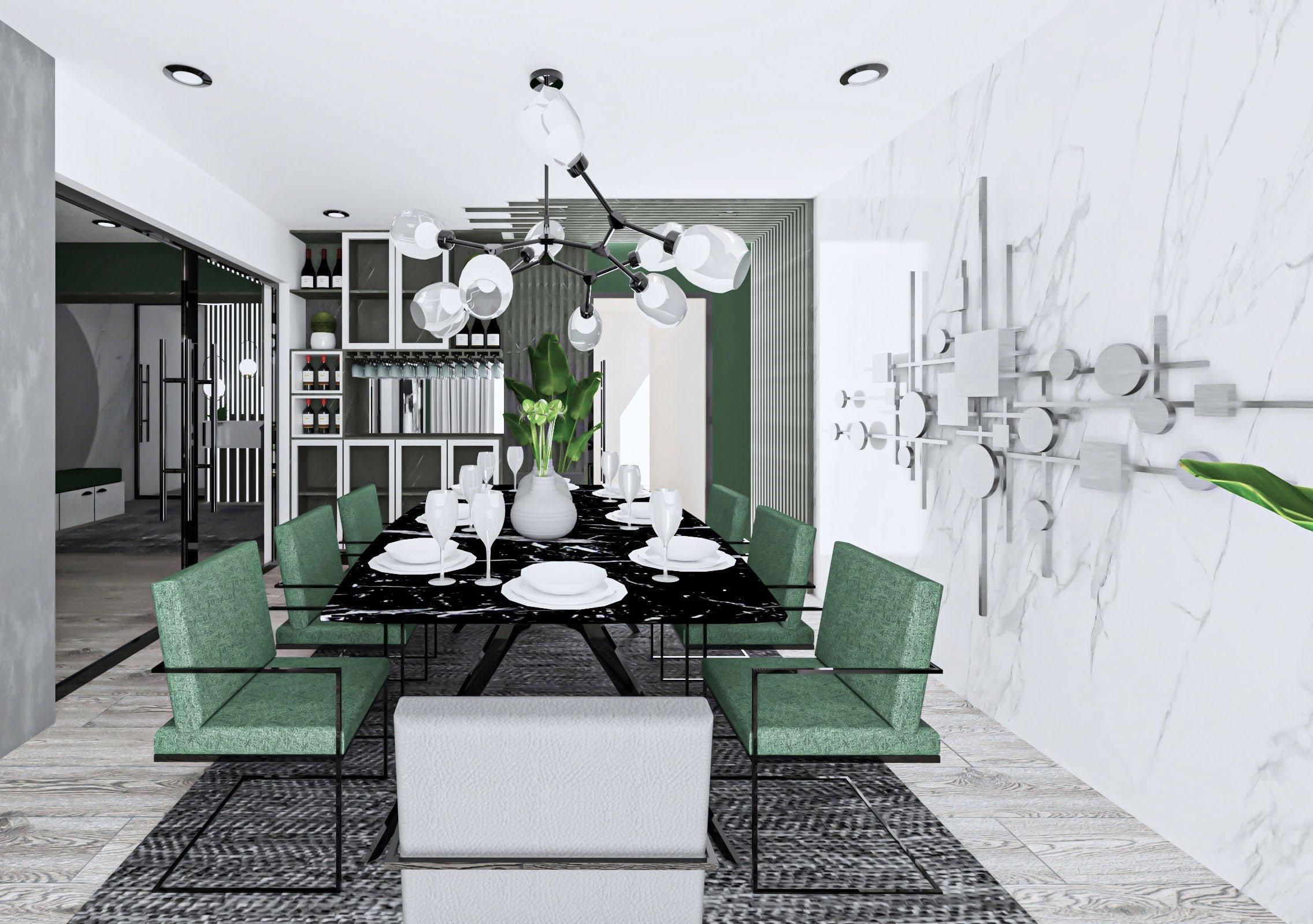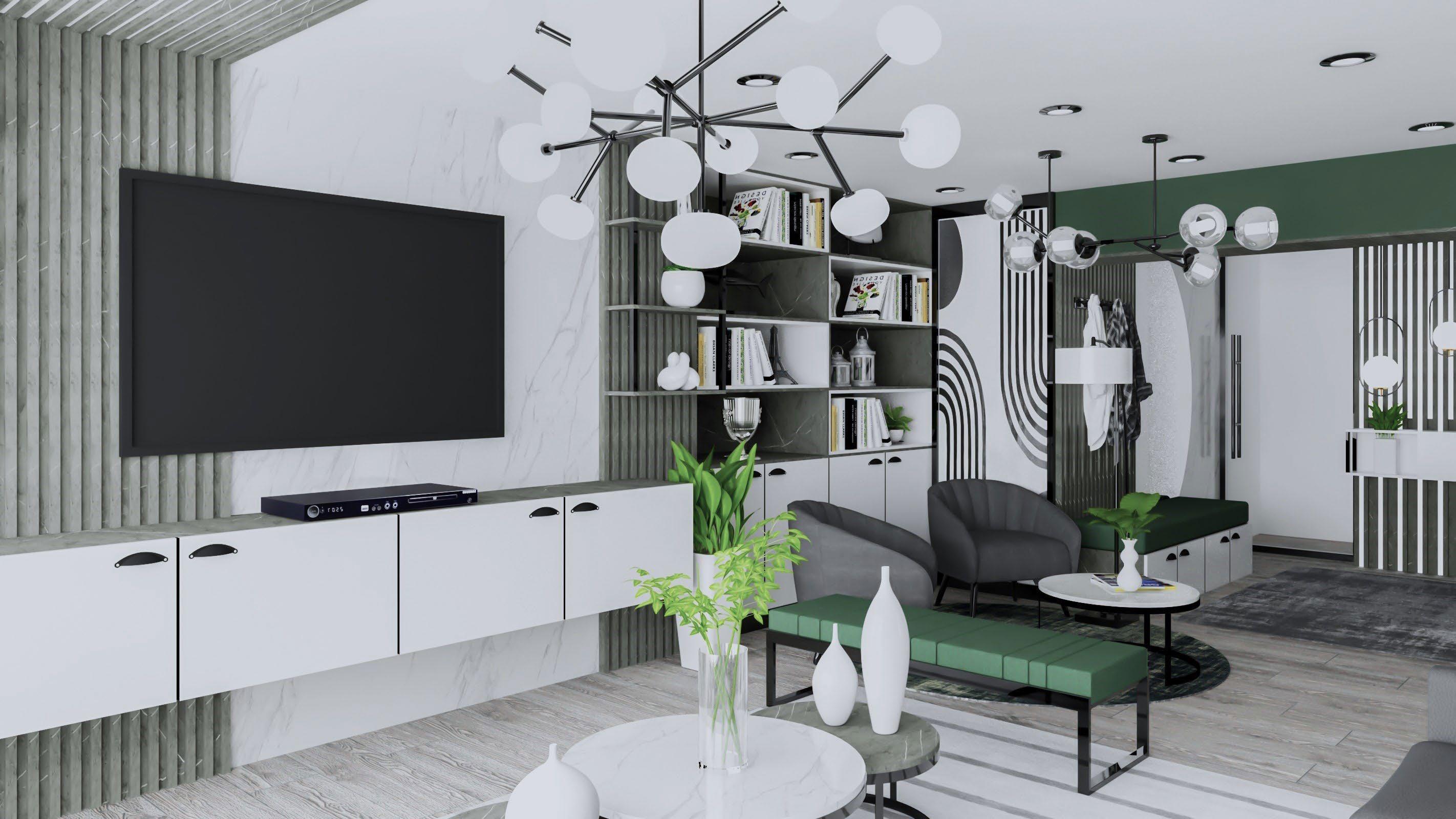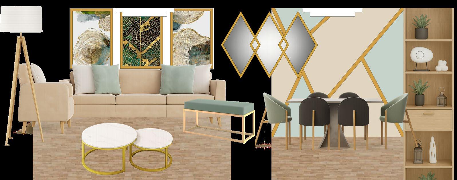 The project develops a compact and carefully organized space in which the color palette and materials respond to the client’s aesthetic preferences and functional requirements. Cream and gold tones provide brightness, elegance, and warmth, while aqua green is applied at focal points —such as chairs and furniture details— to create contrast and a sense of freshness. Calacatta marble-style panels with golden veining reinforce the sense of sophistication, integrating a contemporary and harmonious interior language.