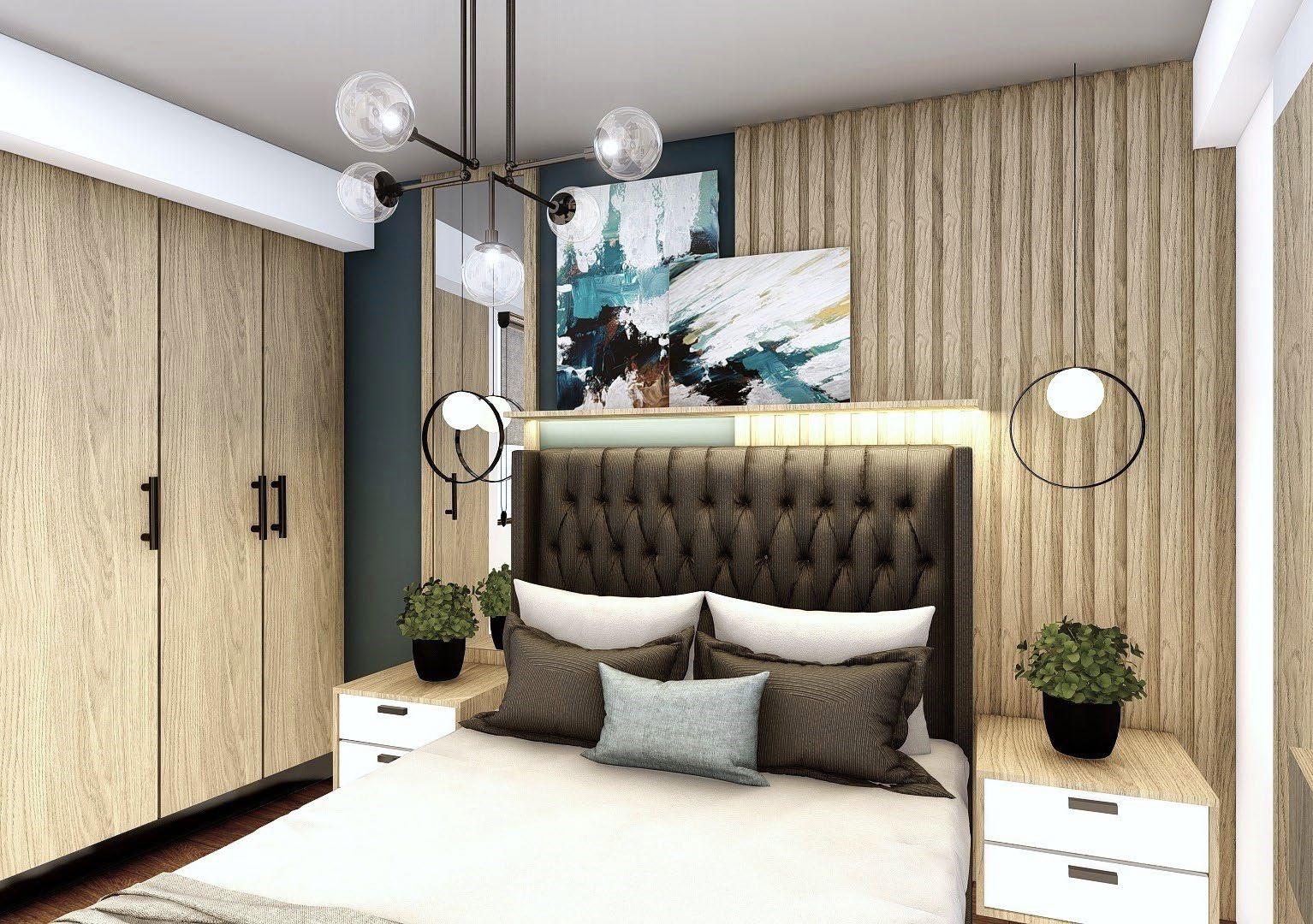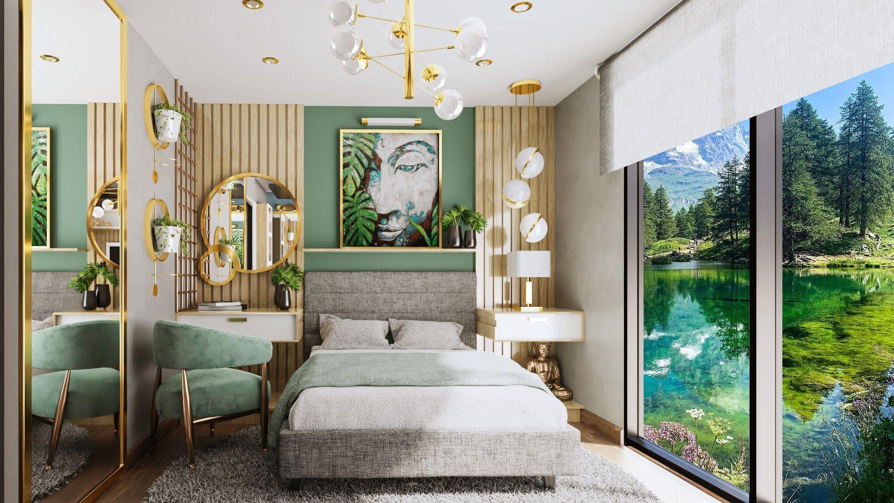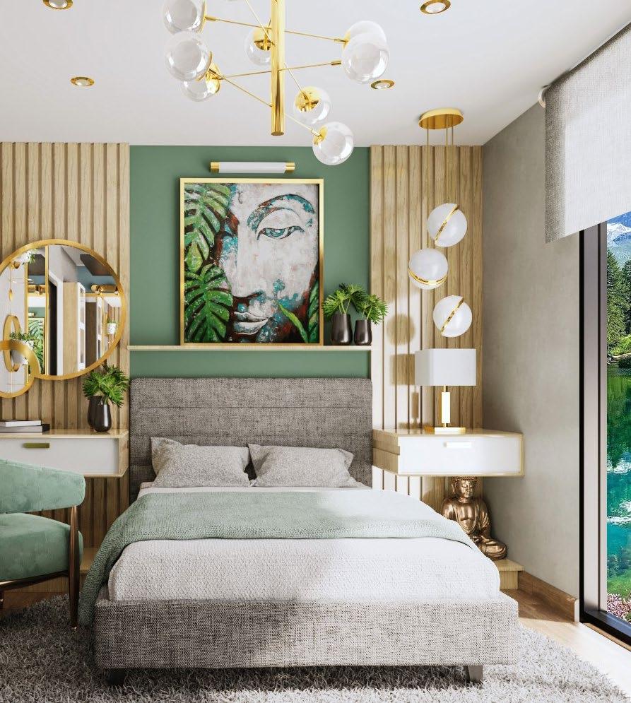 A palette of soft green tones —the client’s favorite color— was used, combined with light wood and golden accents that provided brightness and sophistication. The green wall behind the bed, framed with vertical wooden slats, acts as the focal point of the space, generating depth and warmth. The circular mirrors and golden lamps complement the composition, adding dynamism and a contemporary air with feminine touches.
