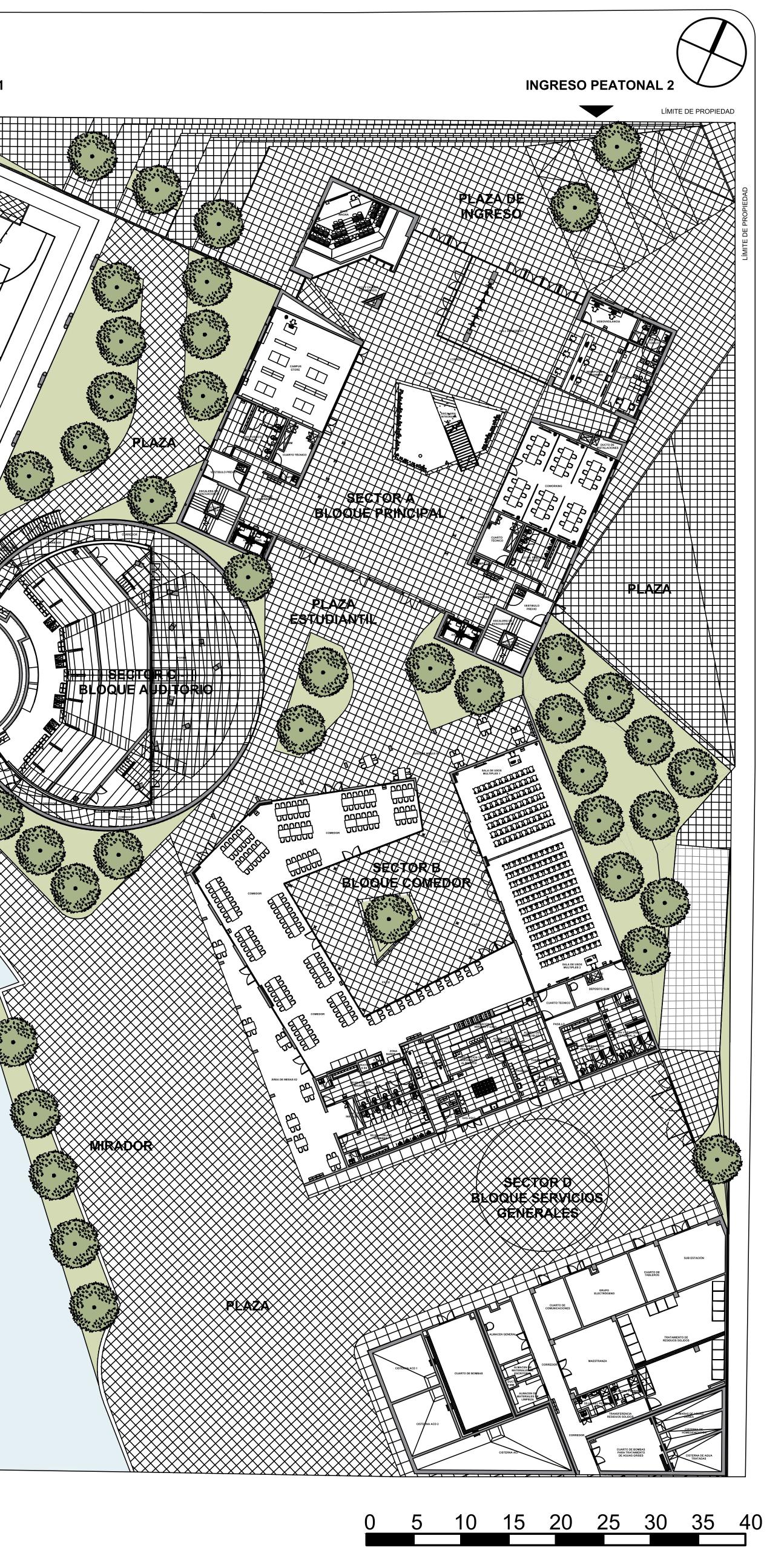 The complex is composed of four blocks: Educational and Administrative, Auditorium, Dining Hall with a Multipurpose Room, and General Services. Each volume fulfills a function yet integrates within a unified system that promotes spatial continuity, dialogue between interior and exterior, and adaptation to the high-altitude climate.