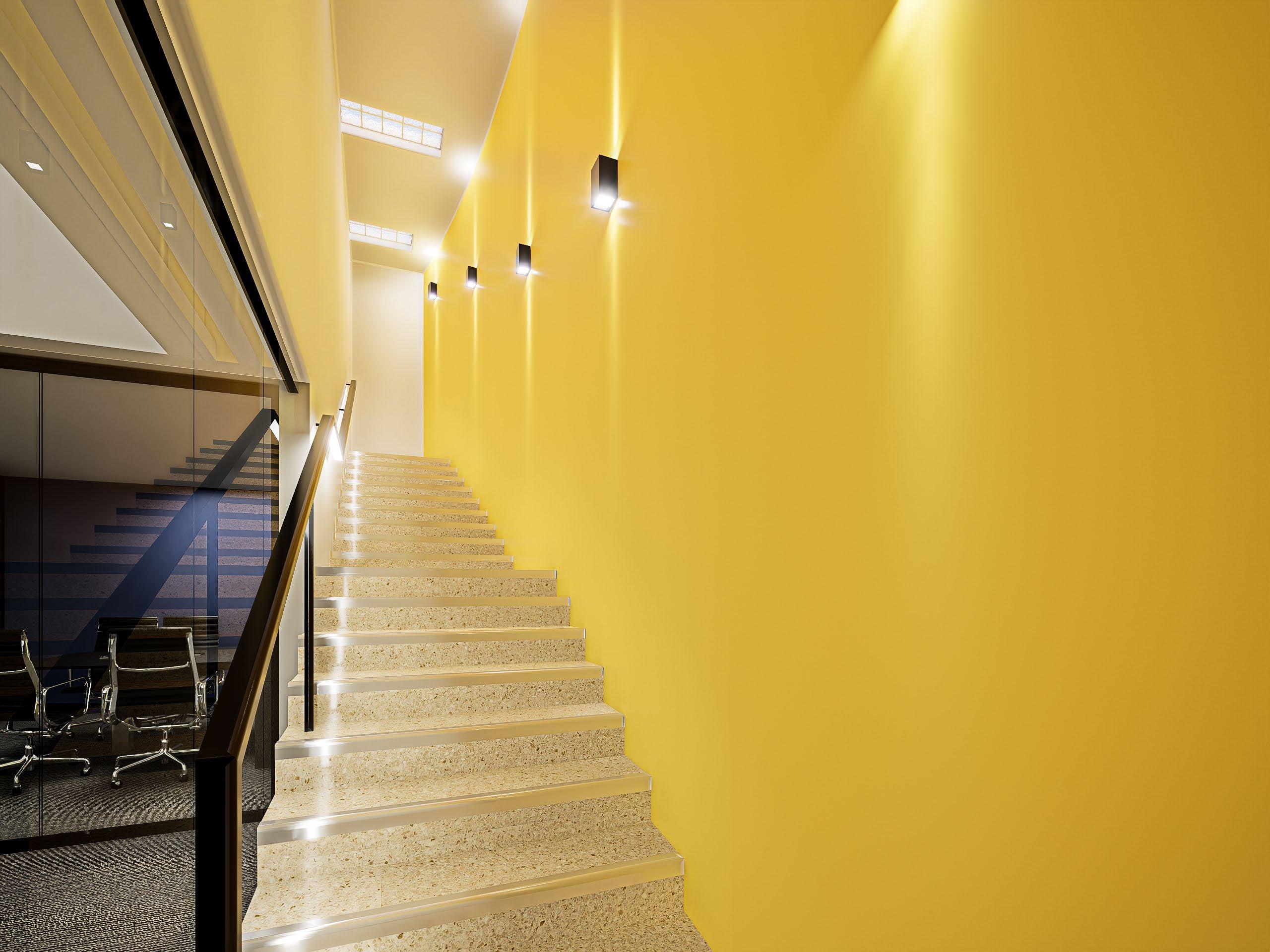 One of the project’s key elements is the staircase, completely clad in yellow and accentuated by linear lighting that reinforces its vertical connection and creates architectural dynamism.