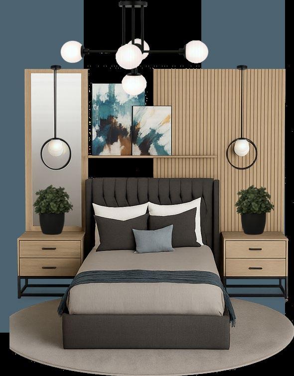 The bed is positioned as the central element, framed by a symmetrical composition of nightstands and pendant lighting. Behind the headboard, a wall with wooden slats and modern artwork reinforces the sense of balance. To one side, a customdesigned desk fulfills the client’s wish to have a functional area for her personal activities.