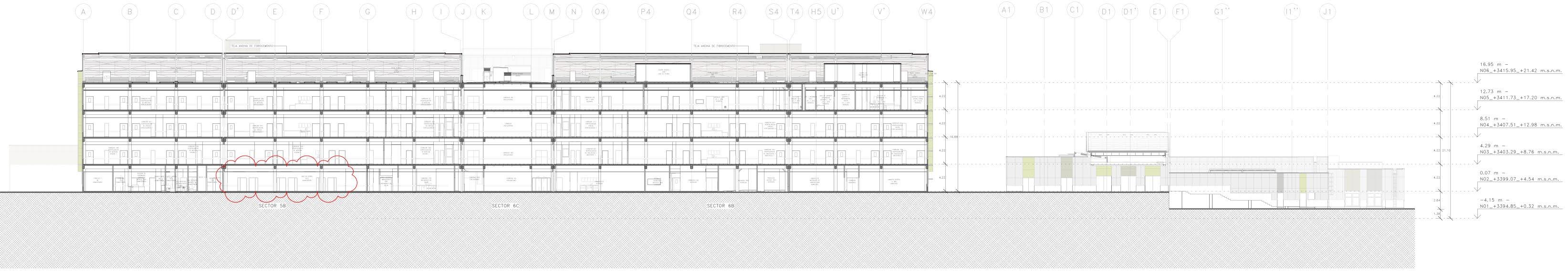 The architectural proposal reorganizes the partially built structure to optimize circulation flows, meet current healthcare regulations, and accommodate updated technical and medical requirements. The hospital is organized into seven interconnected functional sectors across five levels, ensuring a clear separation between public, medical, and technical areas and facilitating efficient vertical and horizontal circulation.