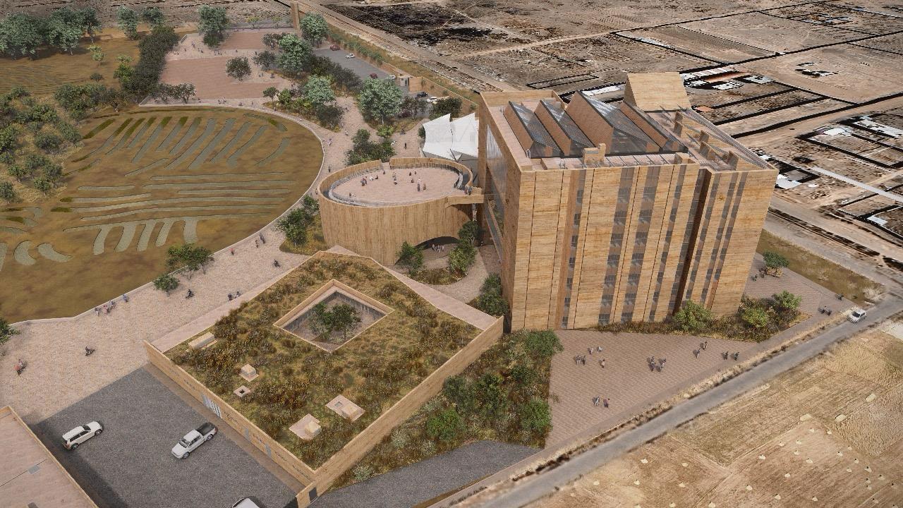 The architectural design prioritizes natural lighting, cross ventilation, and passive solar control using perforated metal lattices and large openings that enhance thermal comfort and energy efficiency. The material palette combines exposed concrete, metal, and warm earthy tones, evoking Arequipa’s identity and referencing the volcanic texture of local sillar stone in a contemporary way.