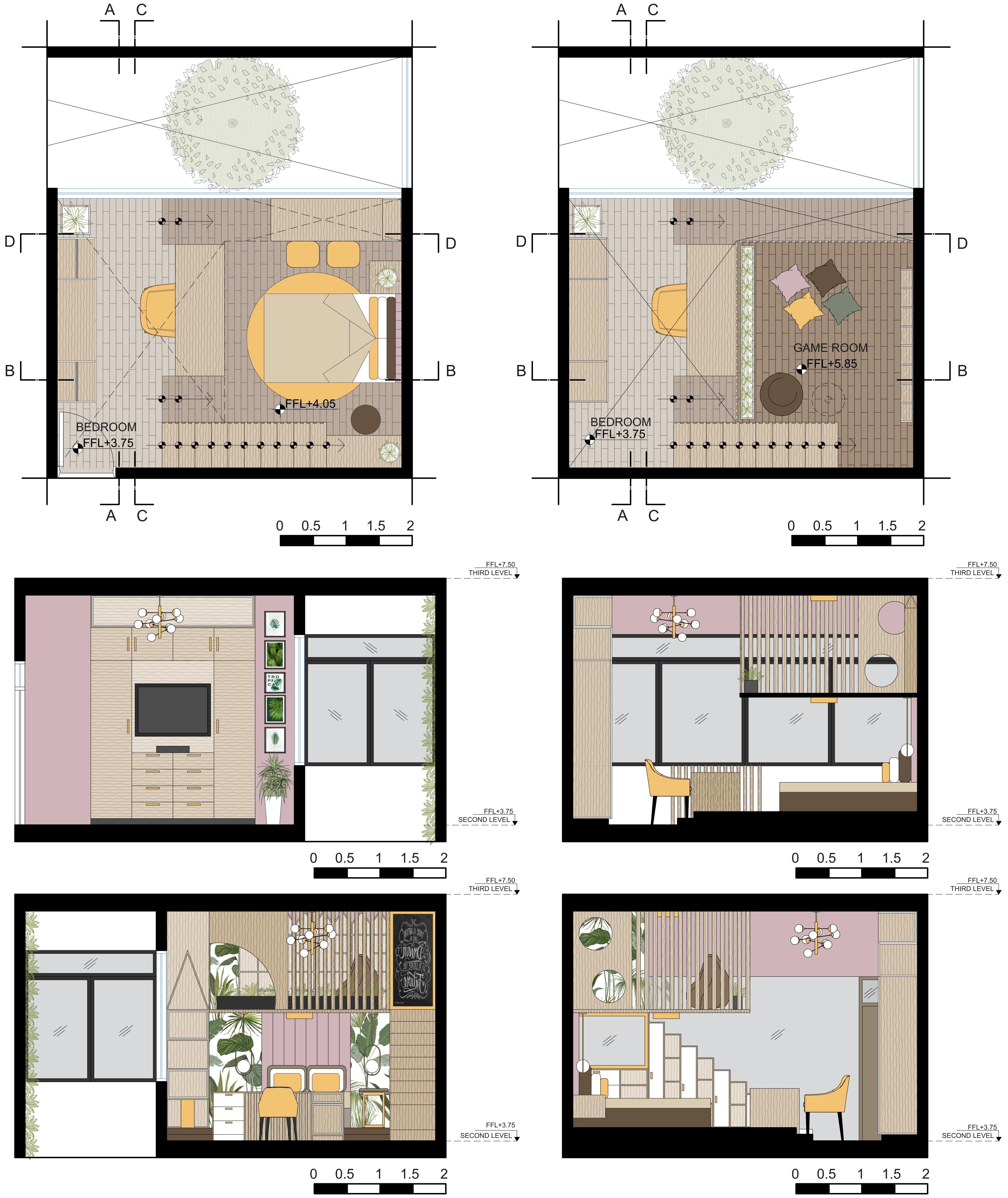 Third Floor:Flexible spaces were proposed, including a study, laundry area, terraces, and resting zones.
