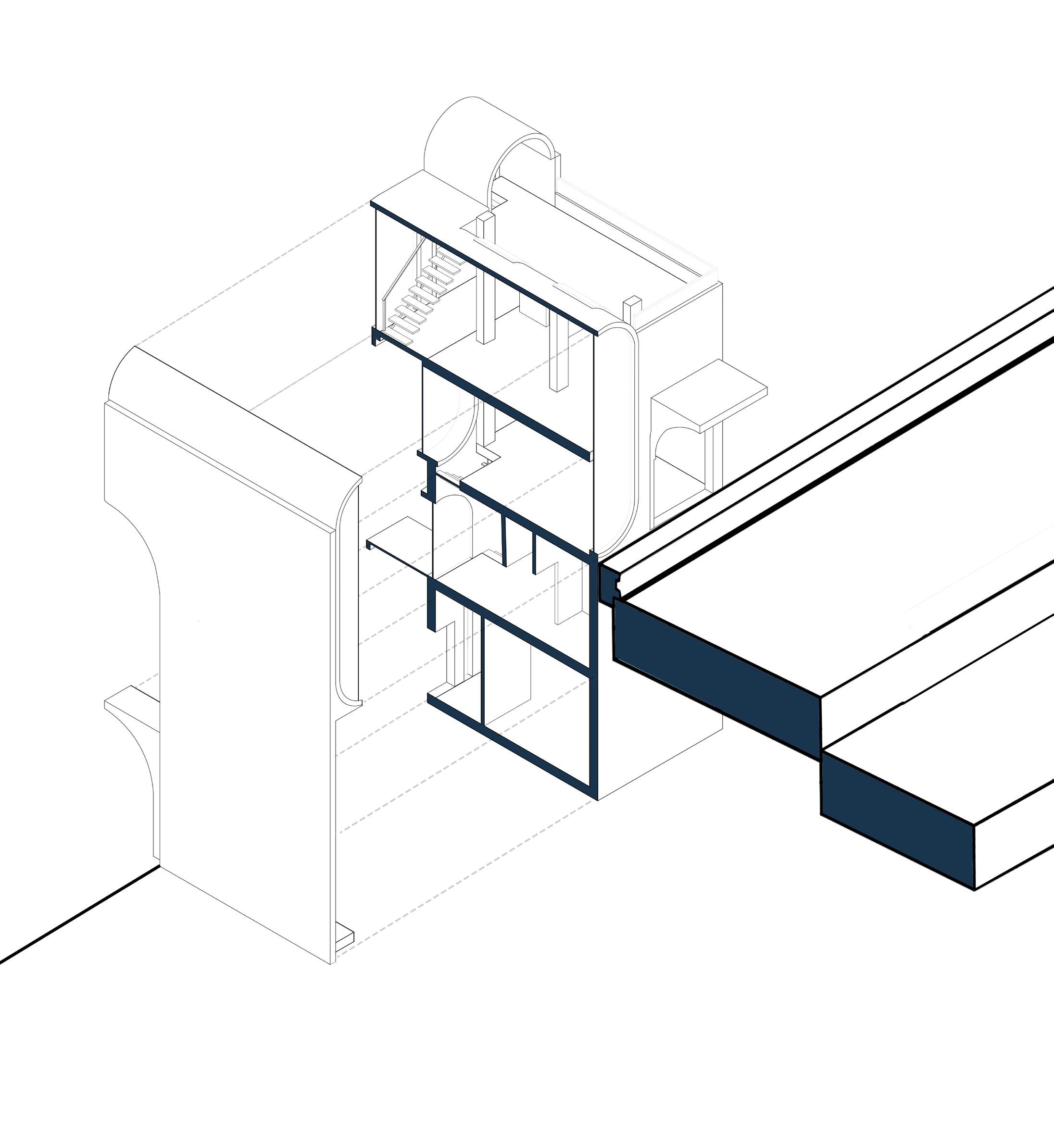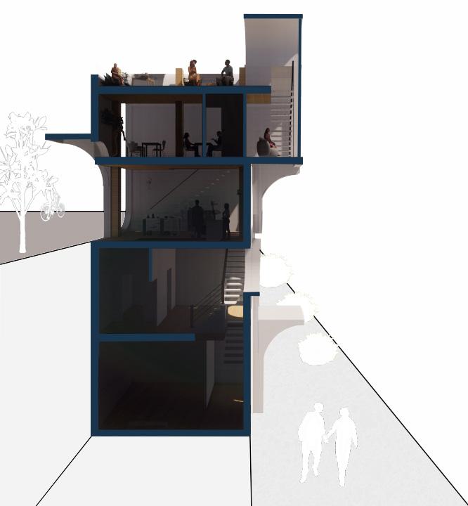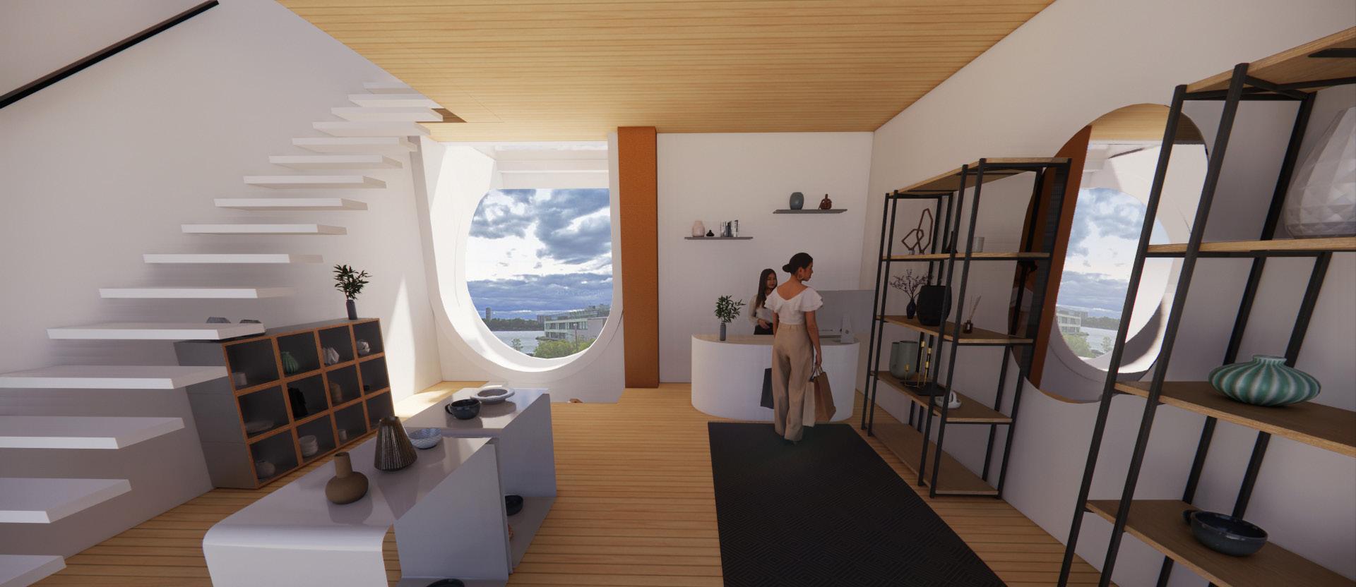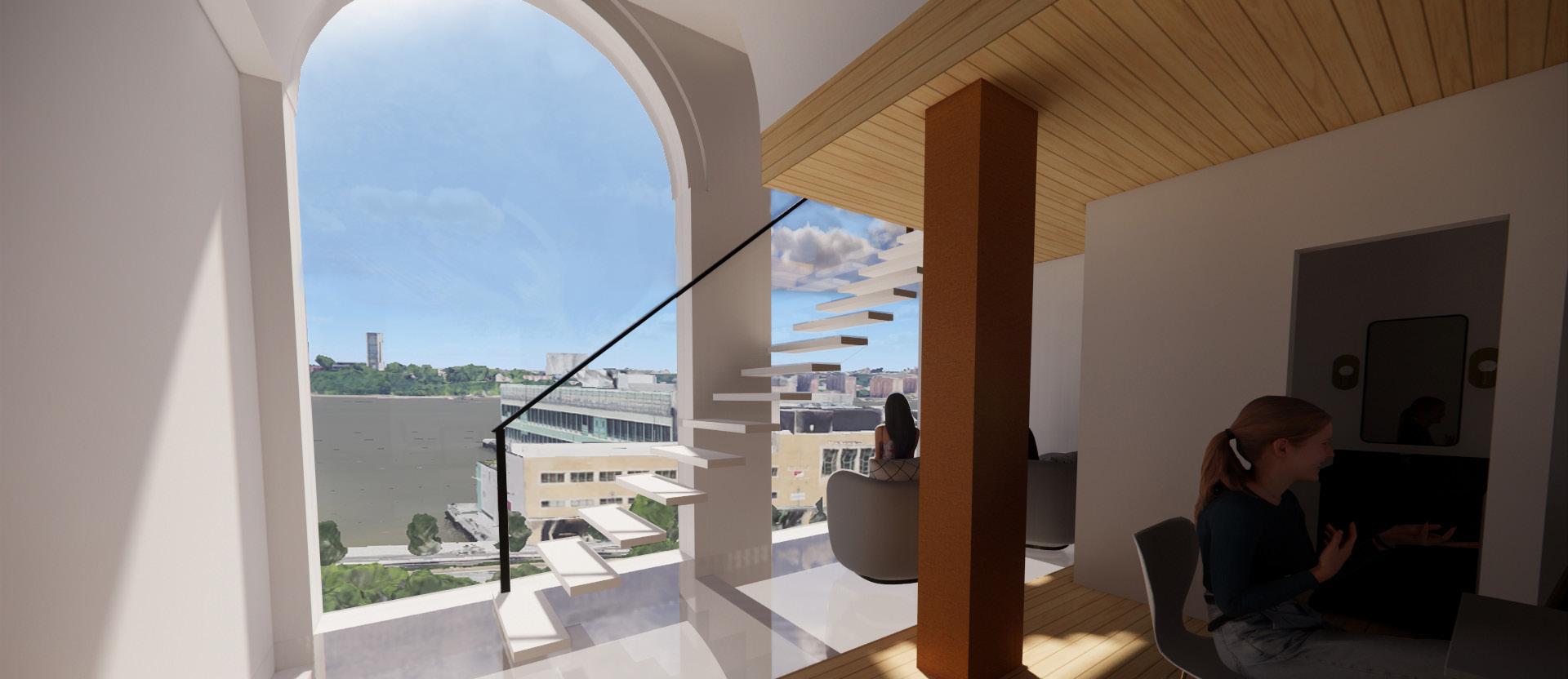 This pottery studio, located along the High Line, integrates the art of ceramics with the urban landscape. Large Curved windows, inspired by the organic forms of pottery, evoke the fluidity and abstraction of the ceramic making process. A spacious terrace extends the studio into the surrounding city space, offering both views and potential for outdoor pottery making. Connecting the small studio to the great city that surrounds it.