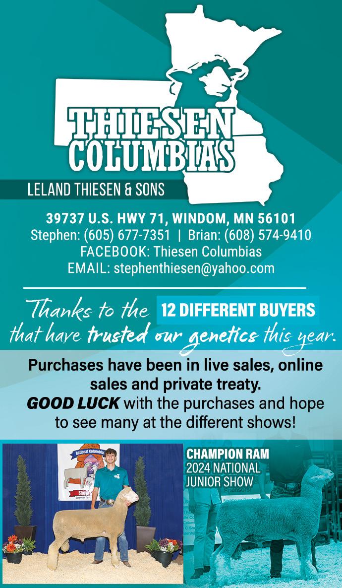 I am looking forward to being the CSBA Board Chair. I am always available via email or phone so please reach out if you have any questions. I believe that together we will be able to continue to improve build the Columbia breed, continue hosting our own National Show and Sale, and continue building the Junior Association. The Spanish Fork NSS was a success and would not be possible without all of you. I hope to see all of you in Findlay Ohio in June 2025.
