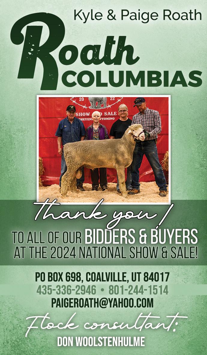 The 2024 National Show and Sale was one to remember! Thank you, Jarvis Family, for hosting! The Jarvis Ranch tour was excellent. It was a time to catch up with Western breeders whom we do not always get to see each year. It was, also, bittersweet to see Woolstenhulme Columbias consign their last Columbias to an NSS. However, it was such a fitting end for Don and Cathy to consign the Champion Ewe. Congratulations and thank you for your many contributions as a part of the Columbia Sheep Breeders Association. (Cathy and Don pictured with Doelene Pitt to the right.)