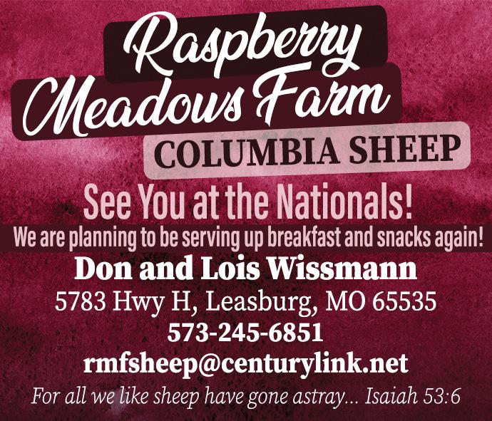 70 SPEAKING OF COLUMBIAS 5 Barr Farms 52 Blackman, Loni 47 Triple C Sheep Co. 63 MKM Farm 51 Geerts Family Columbias 67 Geneva Hills Farm 2 Jarvis Sheep Company 5 KAK Images 69 LM Livestock 69 ND Handspinners Assn 59 Pamp Columbias 7 Peterson Sheep Co. 43 Pitt Family Columbias 71 Premier 1 5 Raspberry Meadows 52 Rickwood Farm 52 Roath Columbias 35 Seifert Farms 70 Sydell 49 Thiesen Columbias 36-37 Woolstenhulme Columbias 70 Worm Columbias Thank you for your support! ADVERTISE IN THE RESULTS ISSUE! AD DEADLINE: JULY 15 Contact Katherine Kuykendall at: 336/302-6162 (Call/Text) katherinekuykendall@gmail.com VIEW NSS PHOTOS ONLINE! KAK Images - Katherine Kuykendall www.kakimages.com Back Cover $250 Inside Covers $350 2 Page Spread $550 Full Page $300 1/2 Page $200 1/4 Page $100 1/8 Page $50 INDEX OF ADVERTISERS