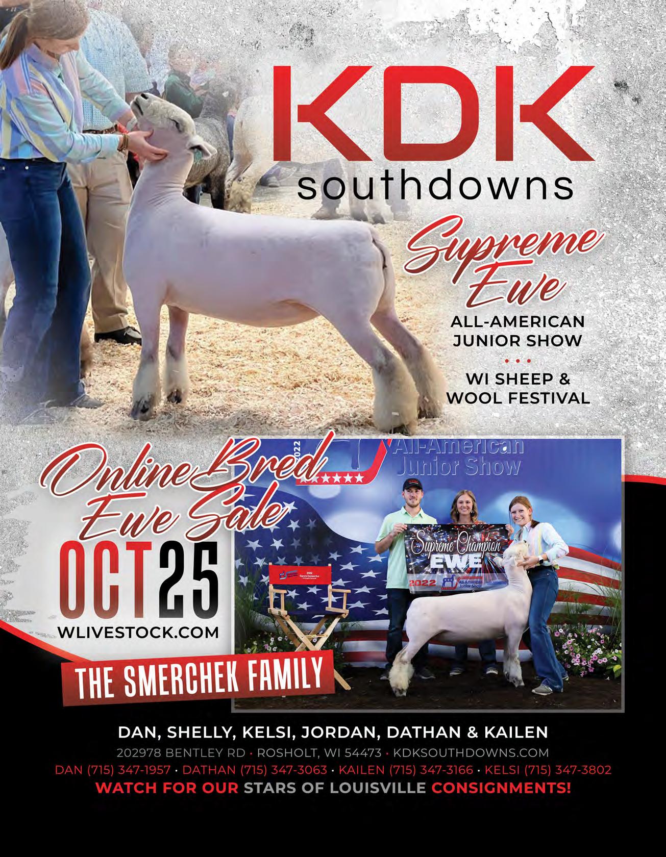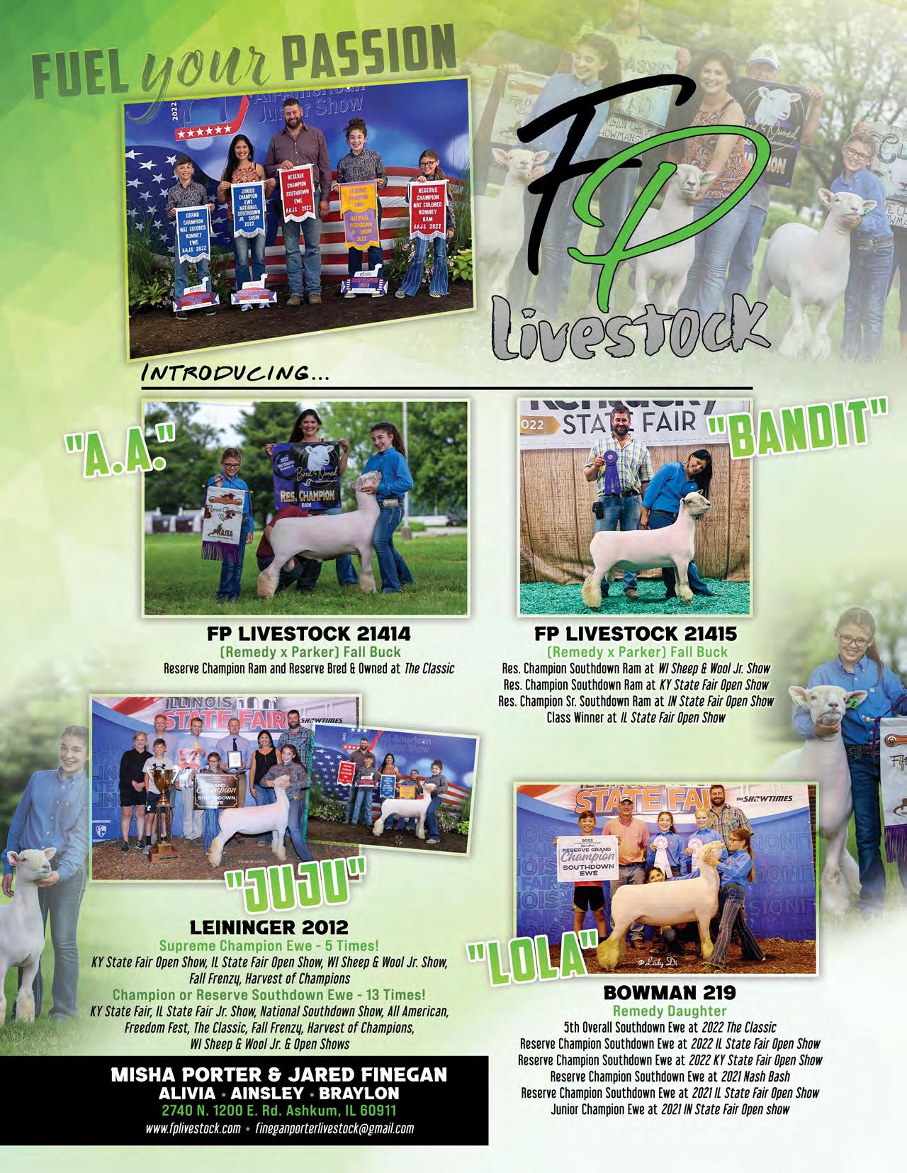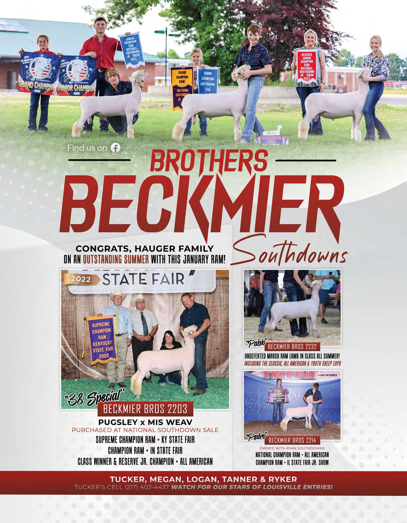 Index OF ADVERTISERS 73 Beckmier Brothers Southdowns 38, 39 Burns Stock Farm 23 Darlington Downs 66, 67 Forsee Southdowns 23 Fowler Southdowns 2 Fox Field Farm 51 FP Livestock 59 George Brothers Show Lambs & Leggett Livestock 71 Gopher Club Lambs & Southdowns 15 Howe Farms 65 KAK Images 75 KDK Southdowns 19 Kuhn Mills Southdowns 43 Longenecker Show Stock 9 Maddox Livestock 4 MB Genetics 62 Midwest Stud Ram Sale 49 Miniter Southdowns 7 Parker Farms 55 Rhodes Southdowns 19 Scramlin Southdowns 56 Small Ruminant Consulting 33 Wilson’s SkyView Farm 74 FALL 2022 SOUTHDOWN JOURNAL
