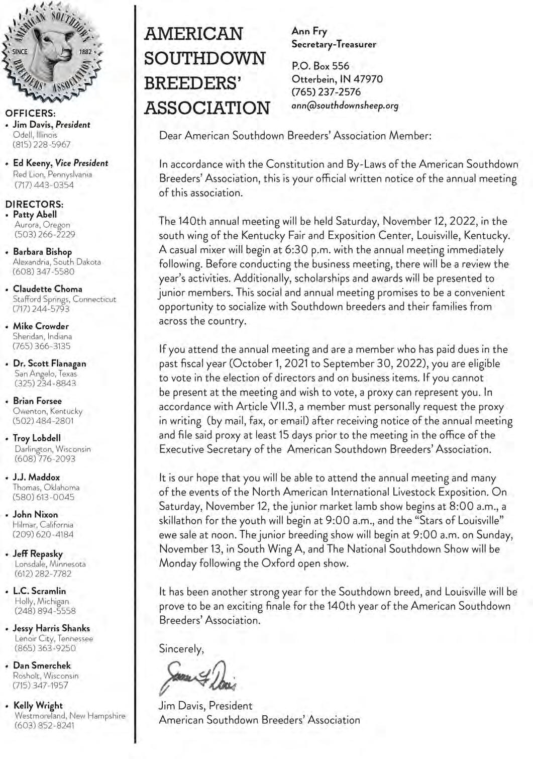 American Southdown Breeders’ Association Ann Fry, Executive Secretary P.O. Box 556 ,Otterbein, IN 47970