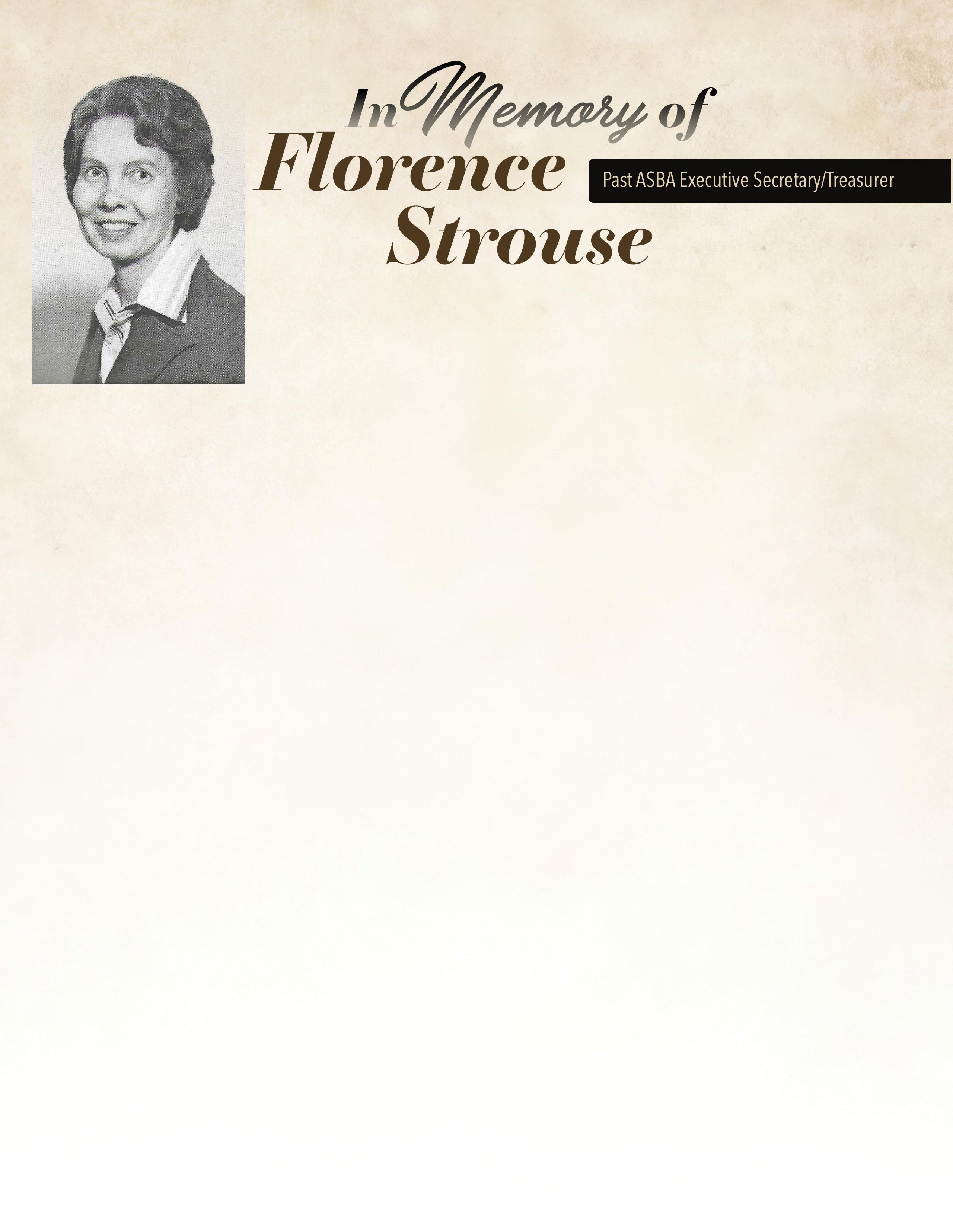 With sadness, the ASBA announces the passing of past ASBA Executive Secretary/ Treasurer Florence Strouse, who passed away on Sunday, December 10, 2023. Florence was employed by the ASBA from 1956, and served as the Executive Secretary/ Treasurer from 1976-1989 (the fifth person to hold the position).