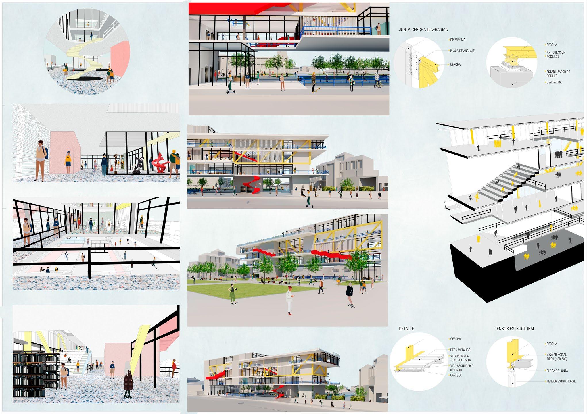 Looping in the program, indoor and outdoor activities are offered, the heart of the building is located in the central space, where a flexible program is proposed thanks to the creation of removable panels that are calculated to fit around the area providing the opportunity to create exhibitions, markets, meeting point anything that might be needed. A semi-open reading corner is proposed in order to expand knowledge, as well as indoor classrooms and a workshop where art crafts and conferences can be held.