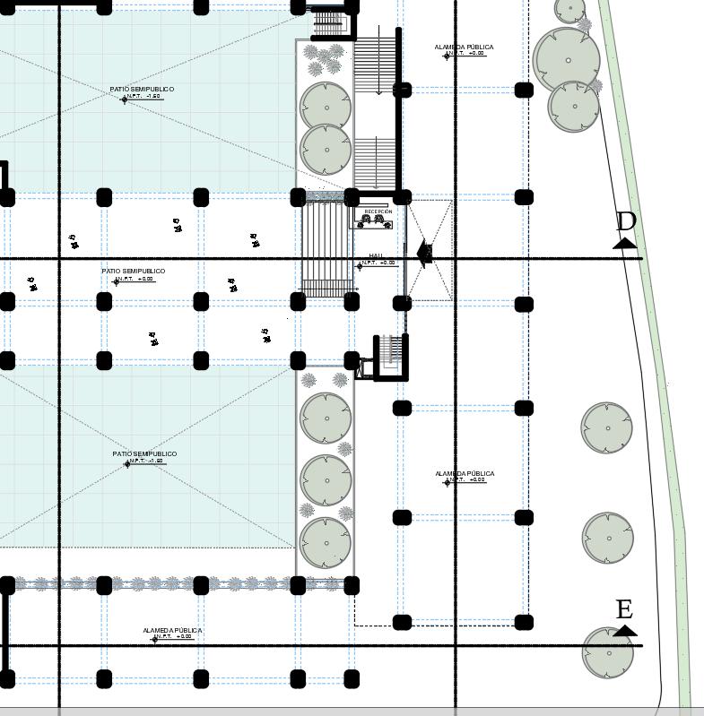 A.VLUISEGUIGUREN JR.LOSCEIBOS A.V COUNTRY A.V COUNTRY A.V COUNTRY RECEPCIÓN TELEFONOS N.P.T.-1.50 ESCALA1:200 PLANTA01 A A B B C C D E CAFETERIAESTUDIANTIL N.P.T.-1.50 CENTROESTUDIANTIL N.P.T.+0.00 ALAMEDAPÚBLICA CAFETERIAESTUDIANTIL N.P.T.+0.00 ALAMEDAPÚBLICA N.P.T.+0.00 ALAMEDAPÚBLICA N.P.T.+0.00 HALL PATIOSEMIPUBLICO N.P.T.-1.50 PATIOSEMIPUBLICO N.P.T.+0.00 HALL N.P.T.+0.00 CAFETERIA PUBLICA N.P.T.+0.00 ALAMEDAPÚBLICA N.P.T.+0.00 PATIOSEMIPUBLICO COCINADECAFETERIA SS.HHVARONES D E