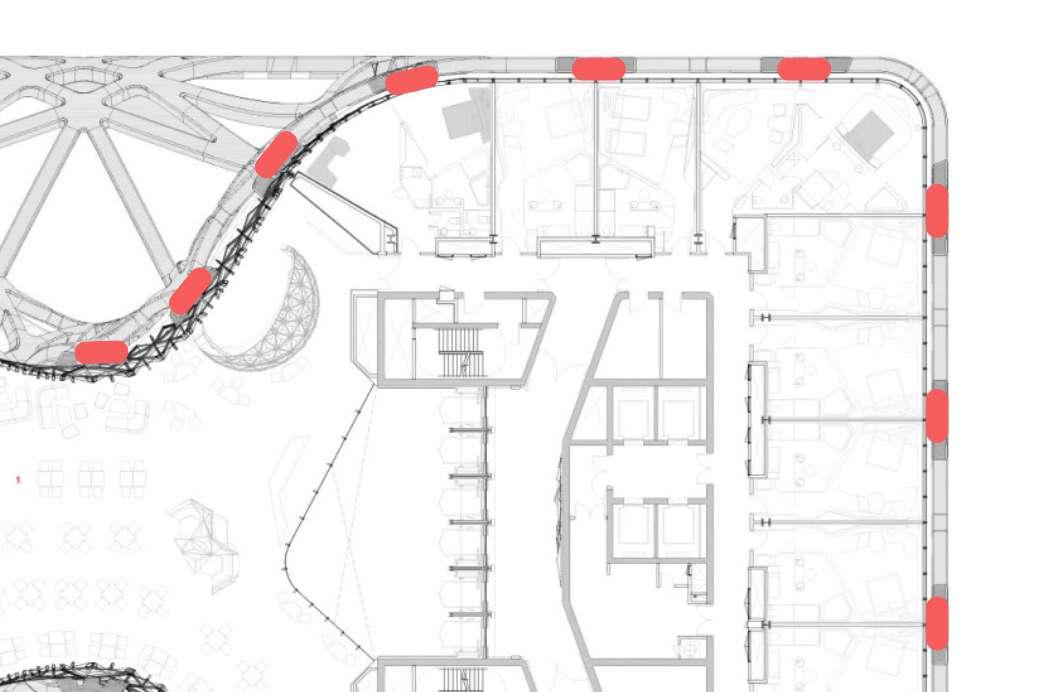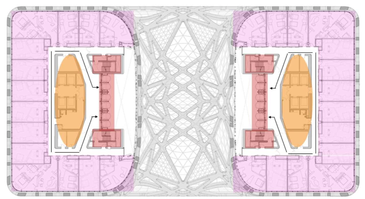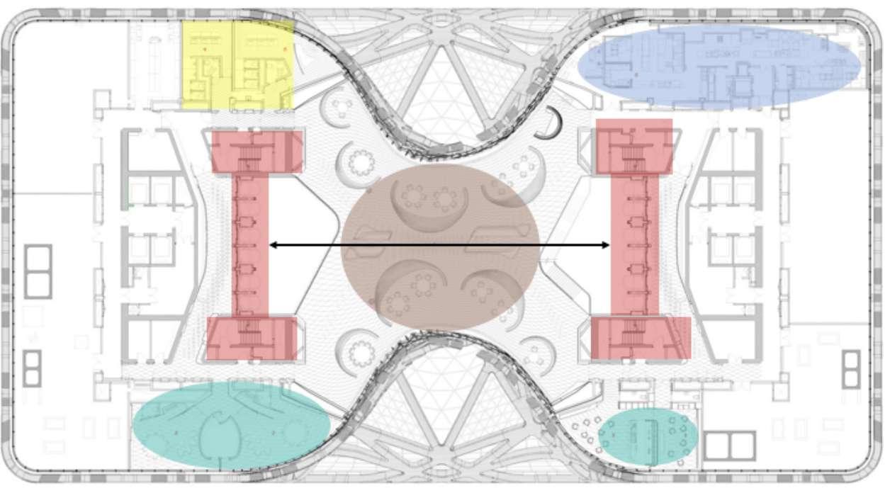 En el interior del edificio los elementos jerárquicos son los ascensores los cuales conectan distinas áreas del edifico facilitando de esta manera la movilidad de sus huespedes.