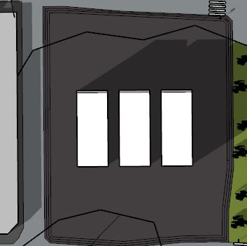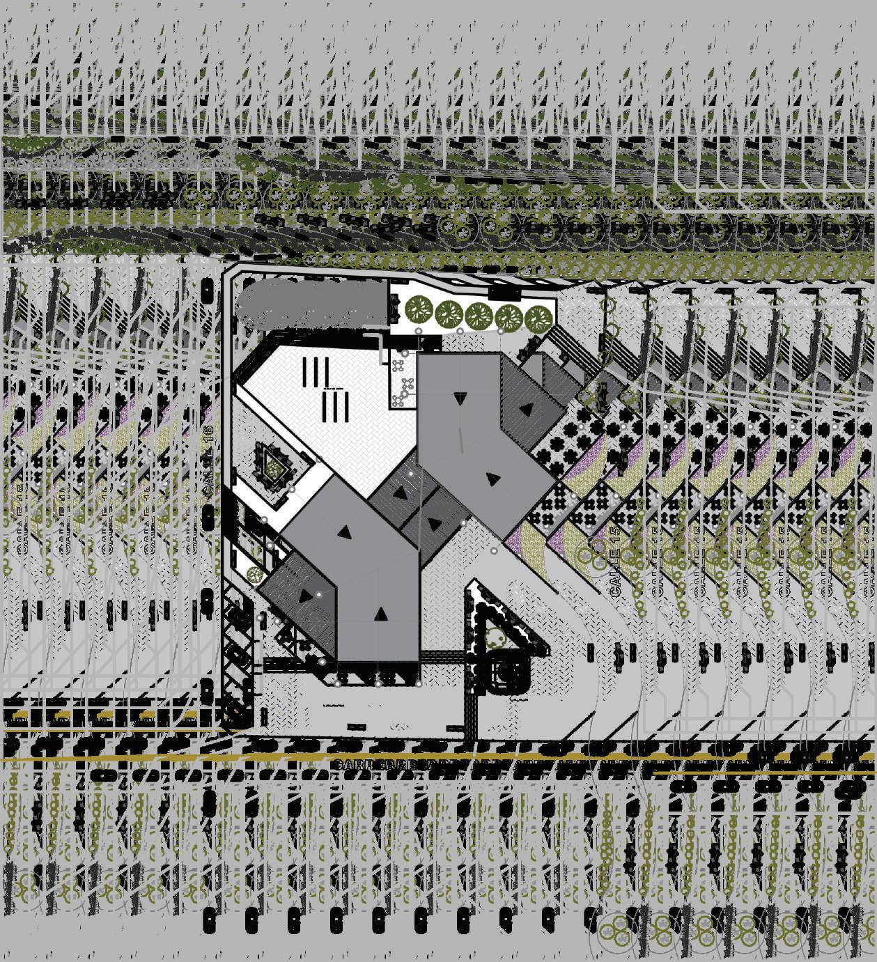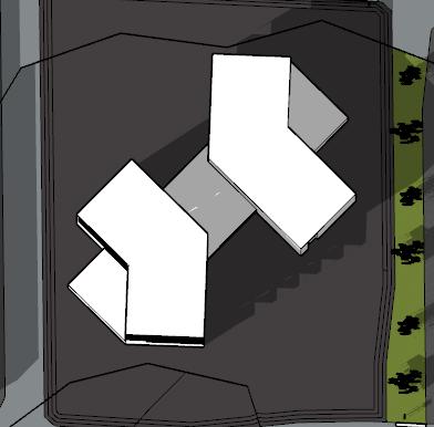 3. de tres volúmenes, dos se fragmentan y giran en las volumetrías principales dando respuesta a la incidencia solar como a las vías y a su vez generando importancia a los accesos principales.