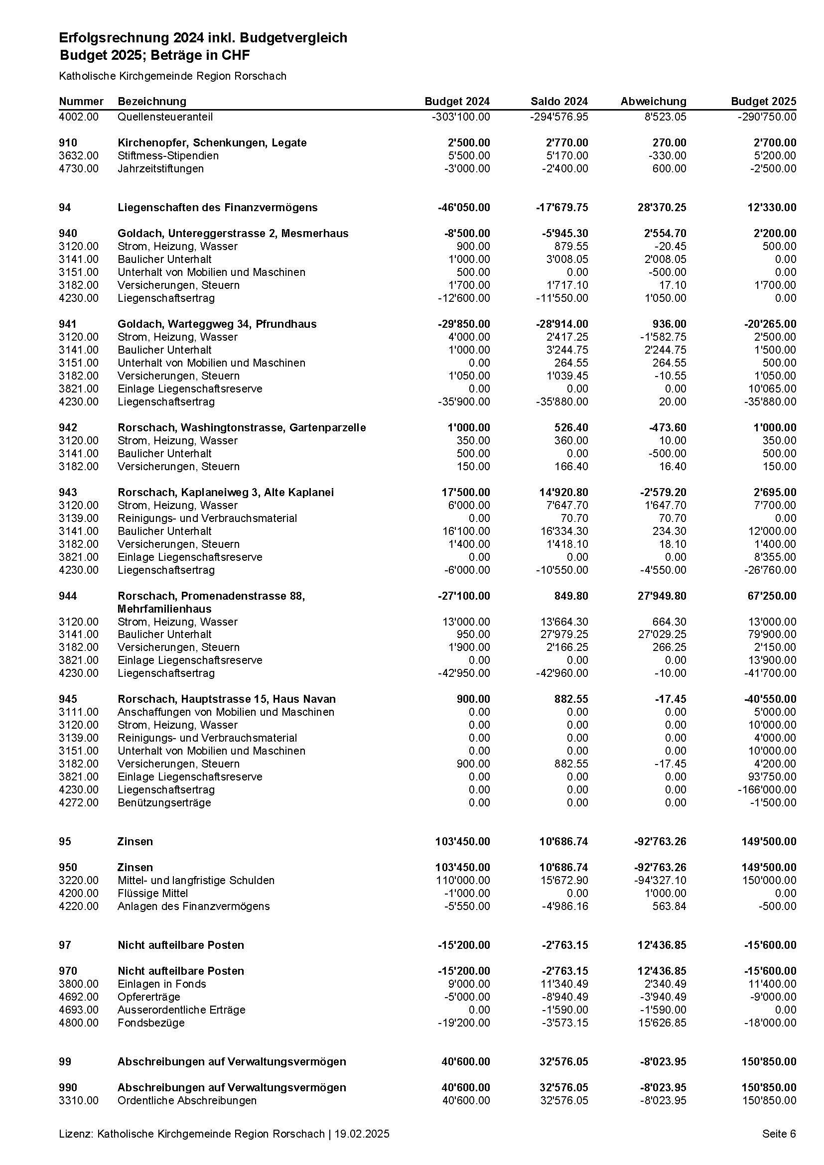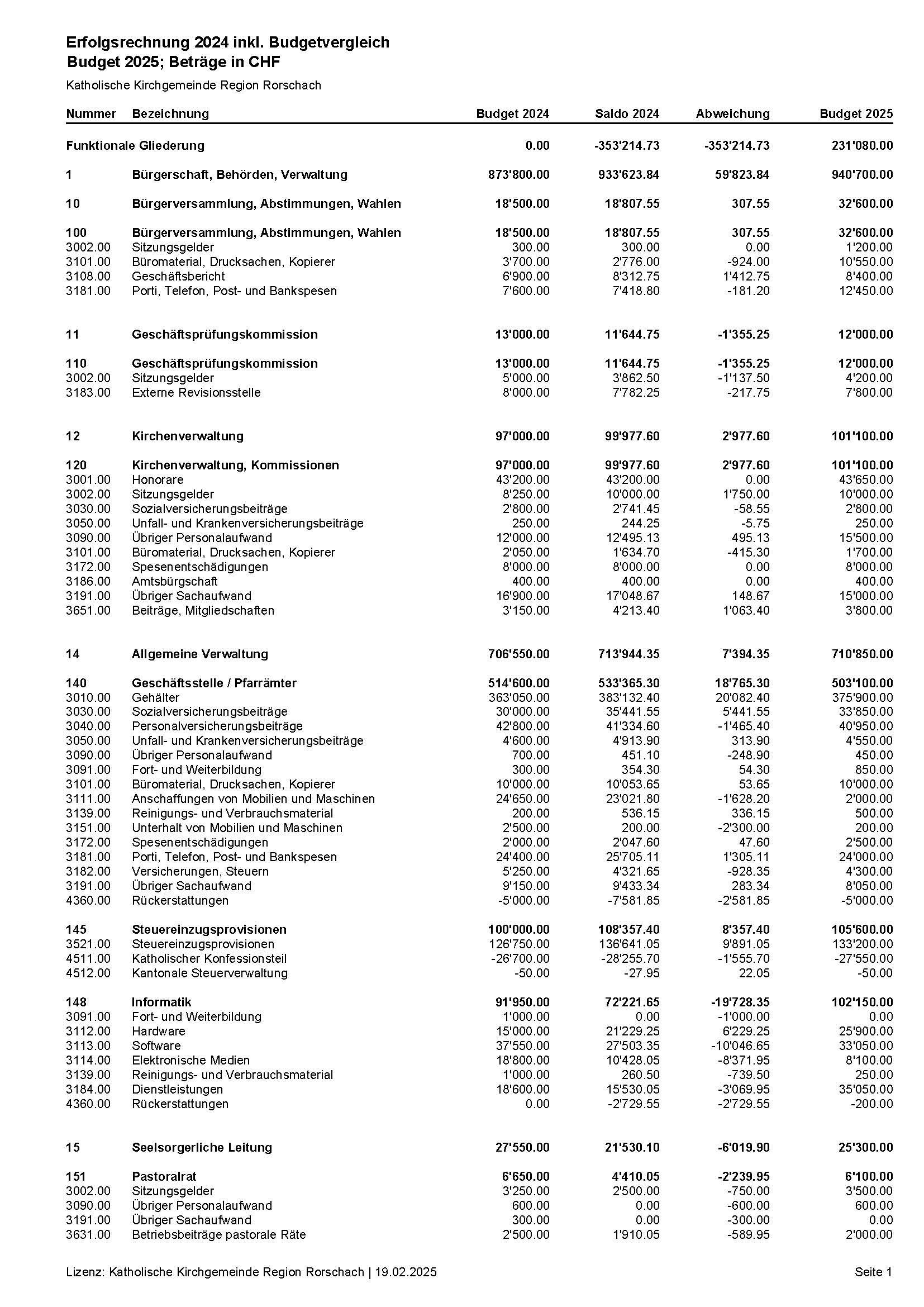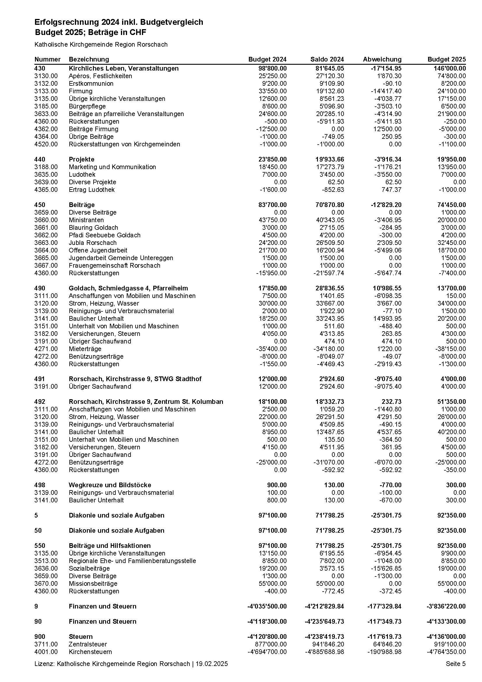 Jahres- und Investitionsrechnung 2024 wurden vom Kirchenverwaltungsrat an der Sitzung vom 21. Januar 2025 genehmigt. Budget und Steuerplan 2025 sind vom Kirchenverwaltungsrat an der Sitzung vom 11 Februar 2025 genehmigt worden.