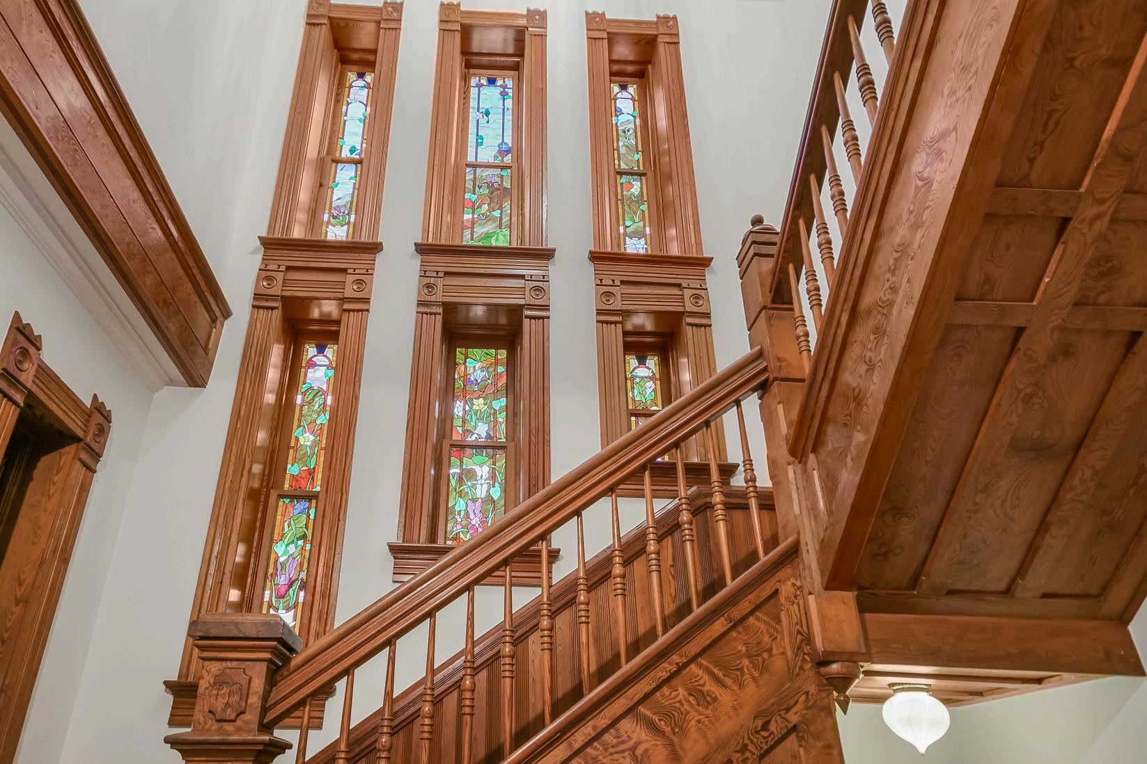 Throughout the home, intricate stained glass windows elevate the interiors. The vibrant hues and patterns embody the artistry of a bygone era.