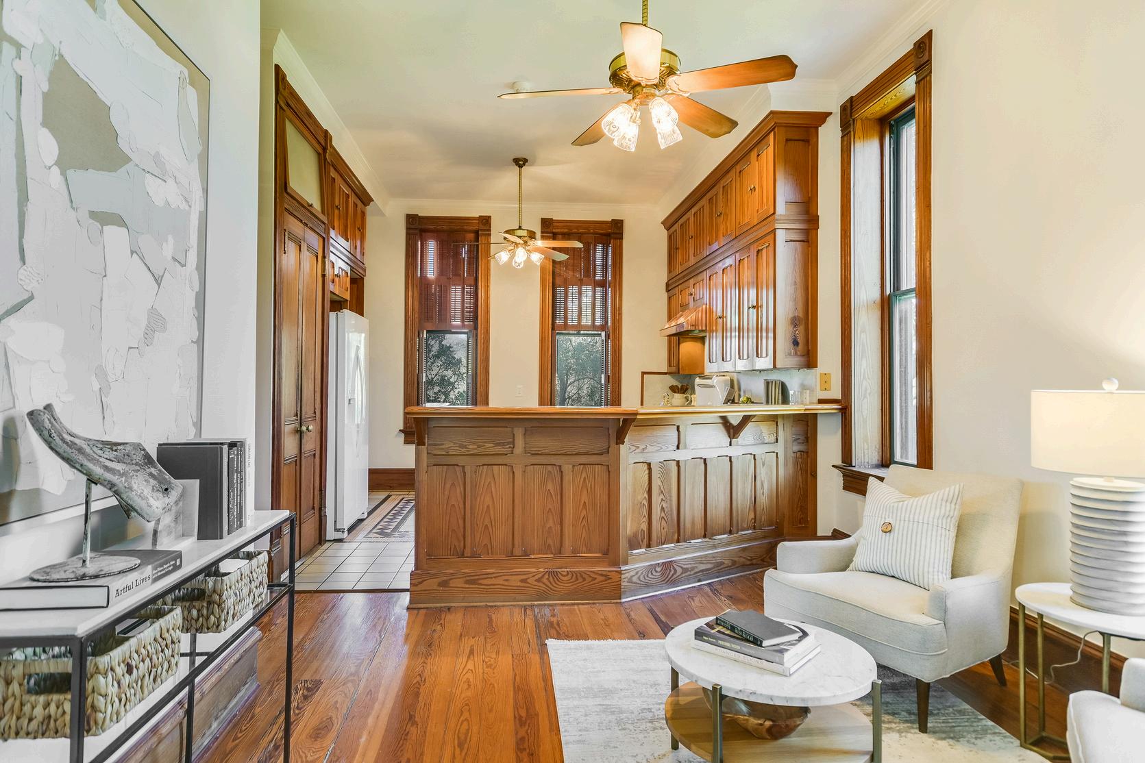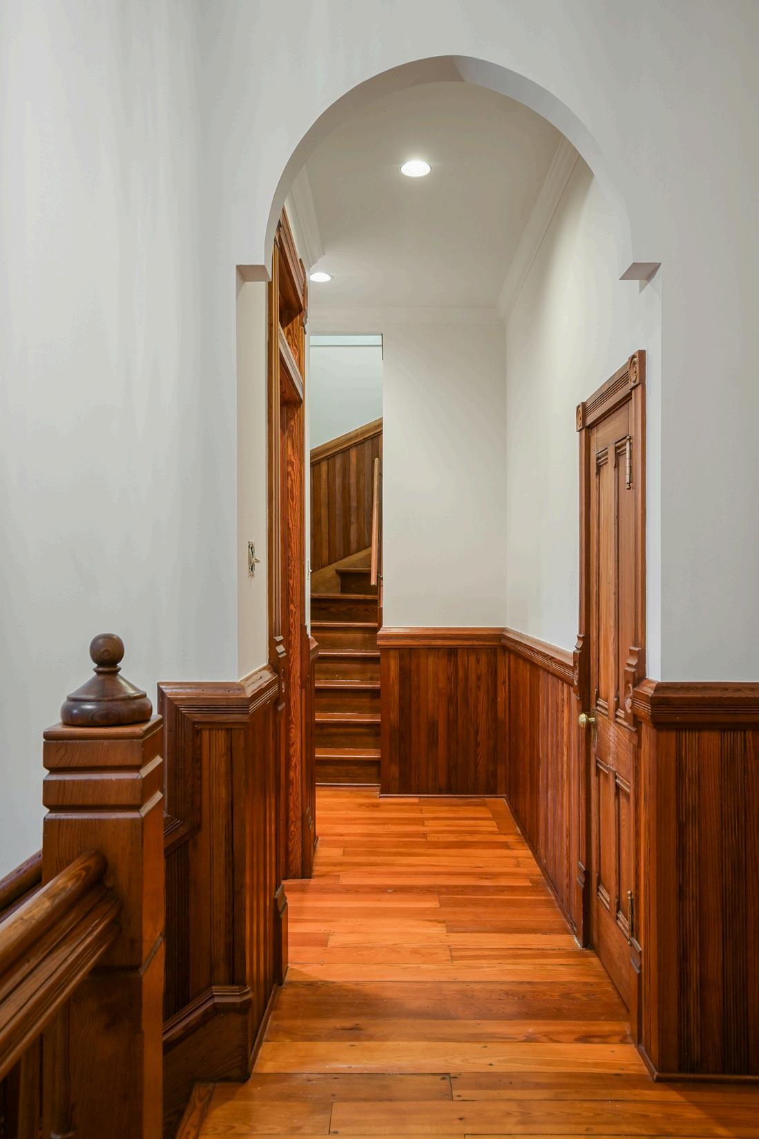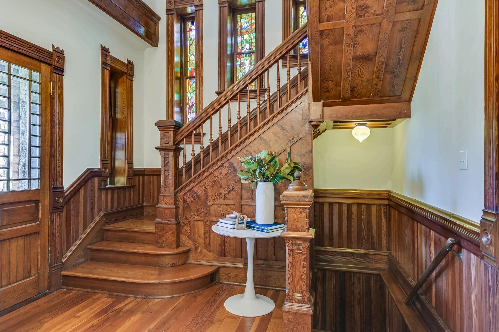 The entryway reveals the grandeur of 19th-century design, with meticulously restored curly longleaf pine woodwork. An original art deco chandelier presides over the main hall, illuminating a pathway rich with historical resonance.